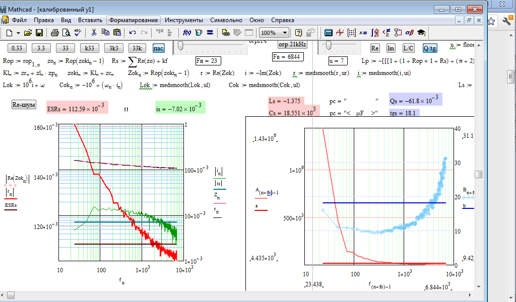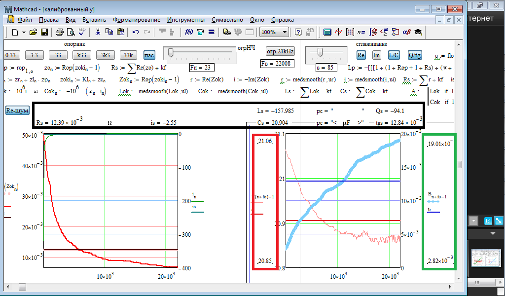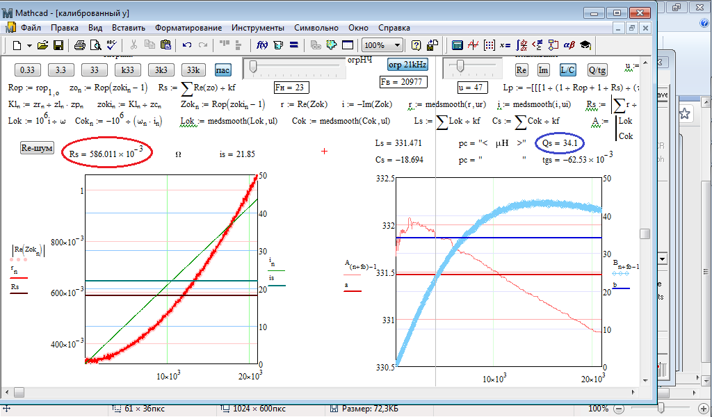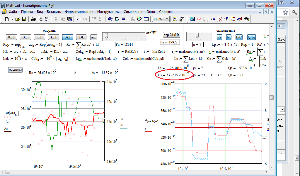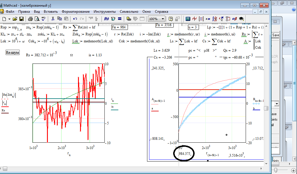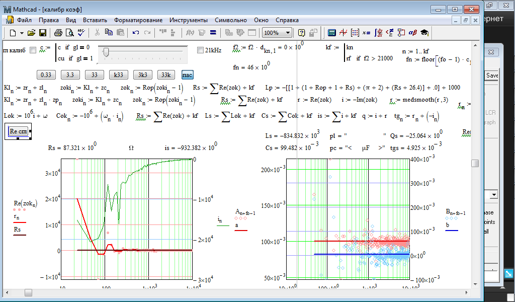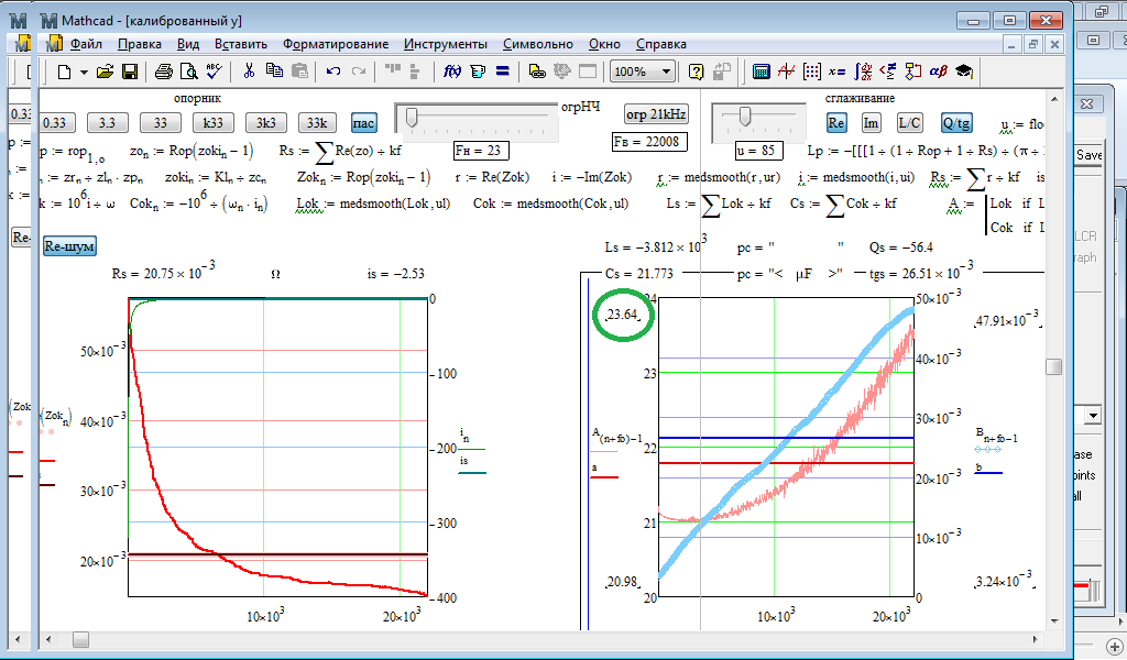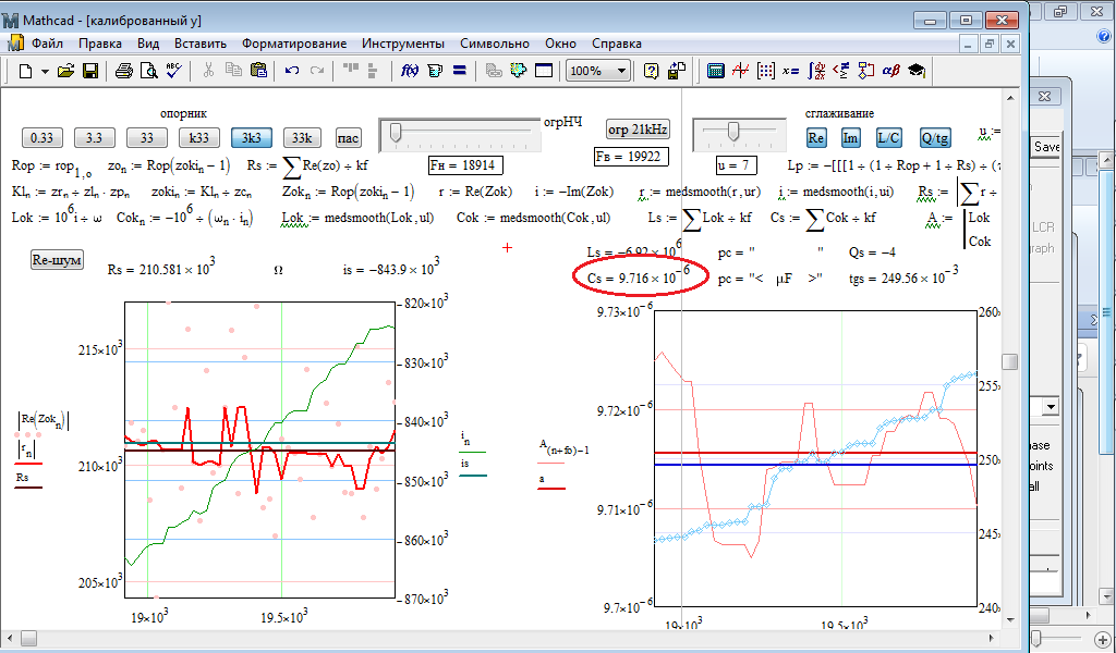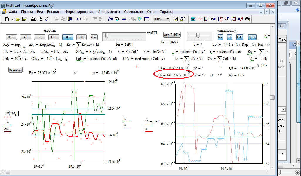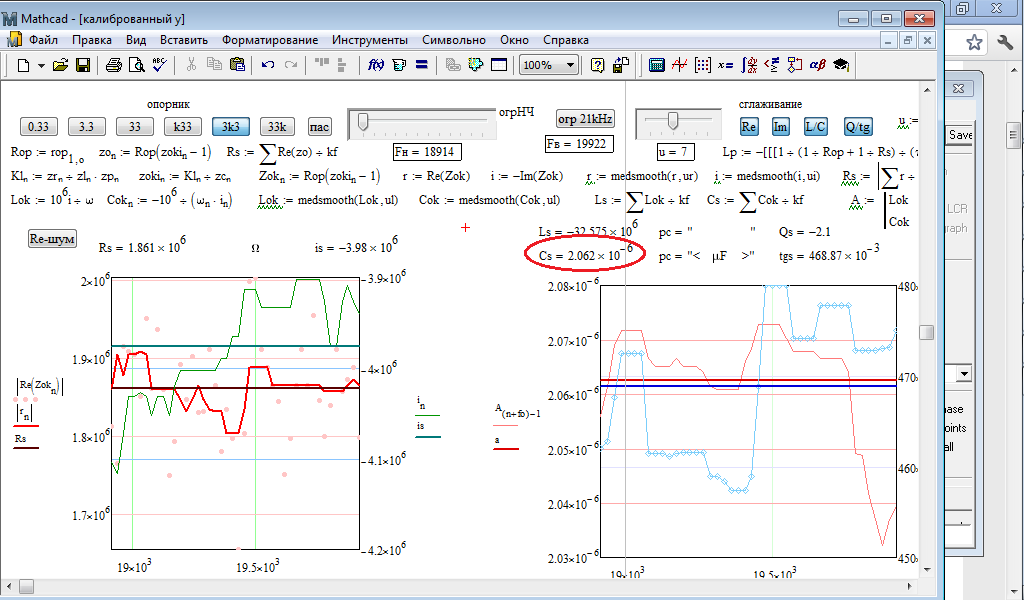 В последних версиях введена логарифмическая шкала сопроитвлений, компенсация паразитных емкостей и сопротивлений ЗК правда для правильной настройки желательно иметь параллельную схему замещения, которая реализована в Маткадовской приблуде Zok5.zip, для компенсации Свх (Сin) подключаем на вход резистор равный опорнику Zm при этом покажет его сопротивление и индуктивность, но это так действует емкость параллельная опорнику, поэтому в Маткаде включаем параллельную сх. зам-я и включаем "-Im", полученную емкость заносим в окно "Cin", делаем измерение на висячих щупах полученную емкость заносим в окно "Clr"