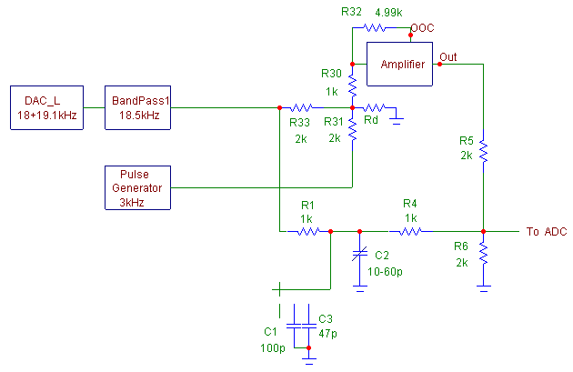 Во всех измерительных схемах для увеличения амплитуды гармоник и комбинационных частот, подаваемых на вход измерительного АЦП, использован метод частичной компенсации измерительных синусов, для чего с выходов полосовых фильтров синусы подаются не только на проверяемый УМ, но и в смеситель (резисторы R1-R5), при этом амплитуды на выходах фильтров и УМ такие, что основные тоны не превышают разрешённых 3 В для АЦП (т.е. цель полной компенсации не ставилась, т.к. не вижу в ней нужды, но зато это позволяет упростить цепь смесителя), при этом выгрыш реального измерения амплитуд гармоник и комбинационных частот получается не менее 10 дБ в отличие, когда смесителя нет. Резисторы смесителя должны быть высокого качества.