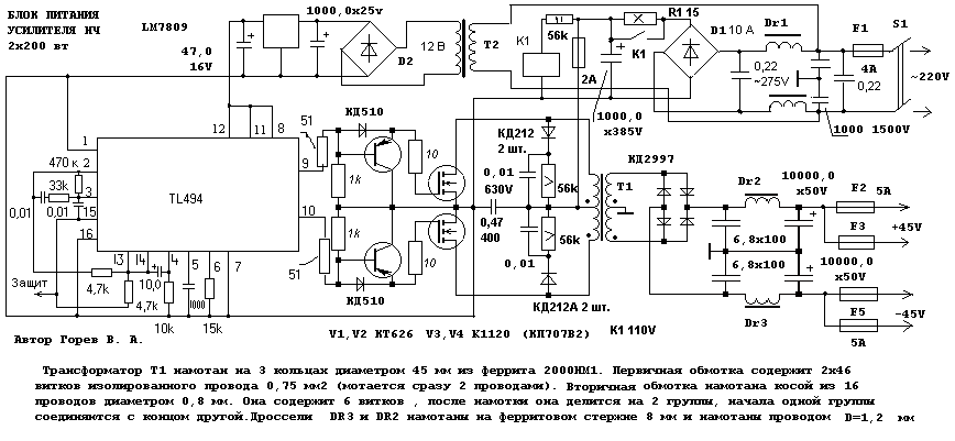 А что с выходом у этого бп? Напряжение не сильно плавает под большой нагрузкой? Скажем, 30А? Хотелось бы все-таки на TL494 построисть БП на 700Вт номинала.. Мощные полевики прямо на выходы 494 подцепить можно? Или без дополнительных драйверов не обойтись? При питании лм-ки от понижающего транса -12В соединить с минусом сетевого выпрямителя, или как? Хотелось бы сразу разузнать что да как, потом схему приблизительную начертить, подарпавить что где не так, и только после этого печатку делать..