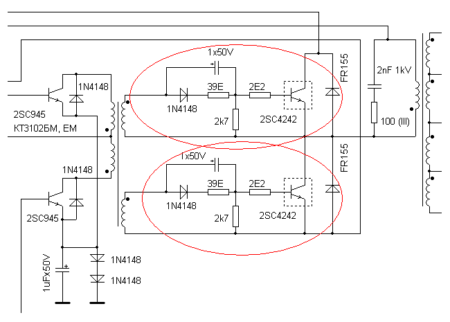 Ниже - схема на согласующем трансе, однако стоят не полевики, биполяры. Вот отсюда и возник вопрос: нужны ли эти детали? или можно будет ограничиться резисторами по 100-1000 Ом параллельно вторичкам на управление полевиками?