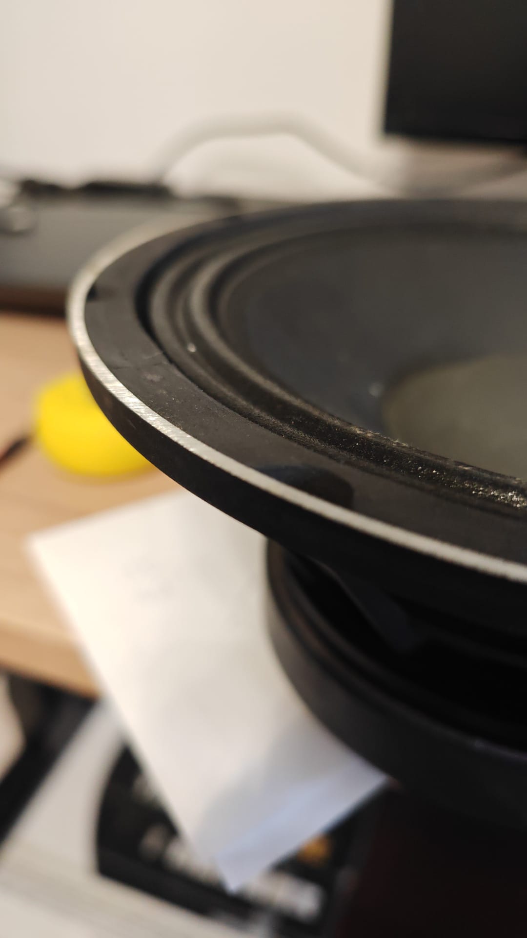 Кольцо из материала стельки напоминающий тонкий войлок с тонкой черной мембраной (геотекстиль?) по периметру диффузора с отверстием для купола в центре. Дает неплохой осевой результат