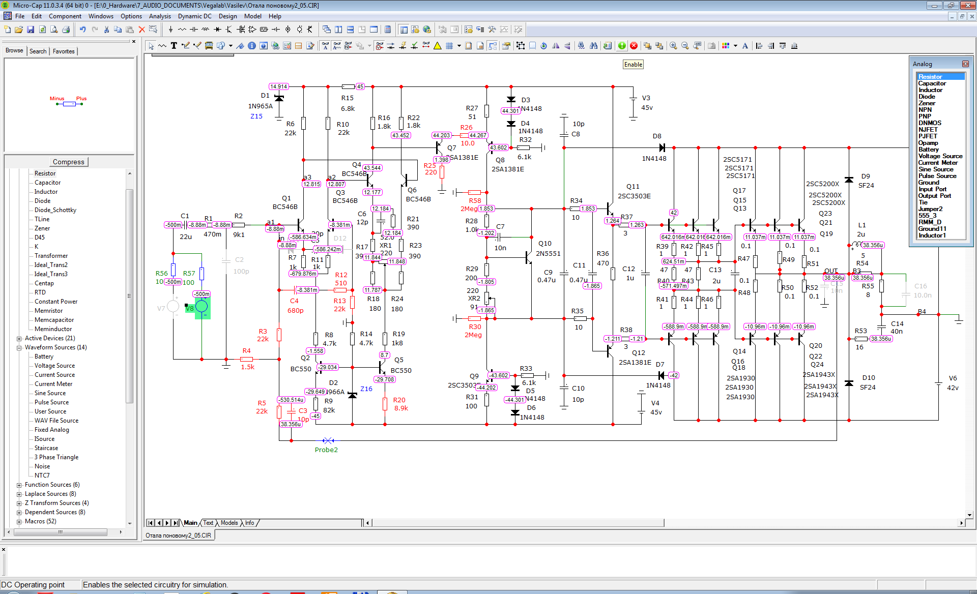 ...Замена транзисторов в модели в первых двух каскадах на 546B для проверки повторяемости параметров. Сильного отличия почти нет, но емкость коллектора в модели у этих транзисторов, по сравнению с BC550, выше в 2 раза.