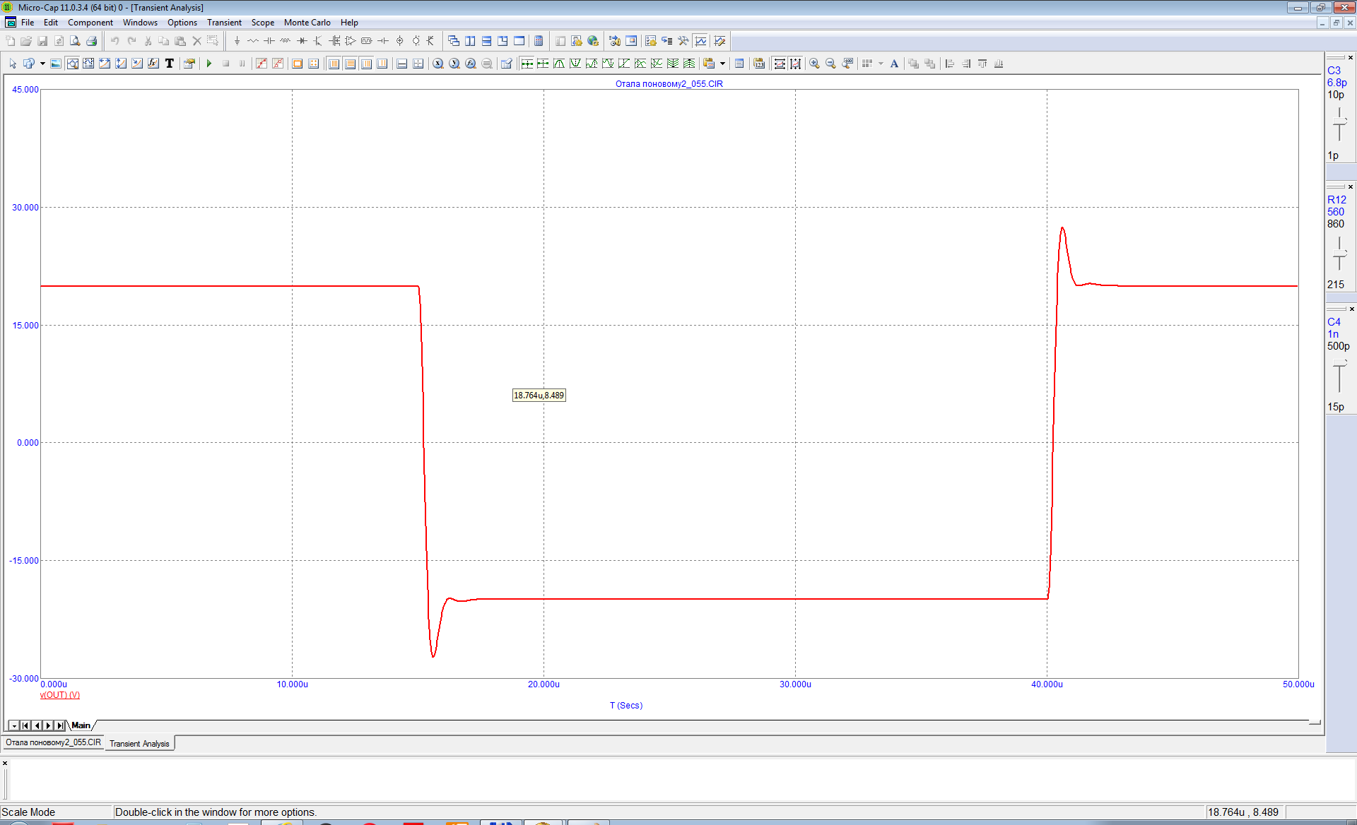 ....И другой вариант включения C3 и номиналы С3 С4 R12. Переходная характеристика, как и должна быть при запасе около 45 град. ( вариант 055)