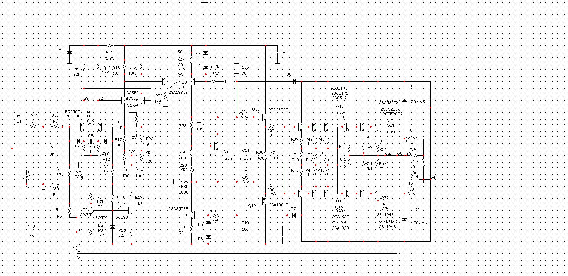 .....Еще раз посмотрел теорию . Может быть устойчивым, если количество переходов фазы 180 град до последней точки с усилением 0дБ на ЛАФЧХ четное, как есть на схеме. Есть, правда, тонкий момент изменения усиления в динамике при больших сигналах, когда меняются емкости переходов и частота среза каскадов, который в модели не всегда можно учесть, а это меняет АФЧХ.