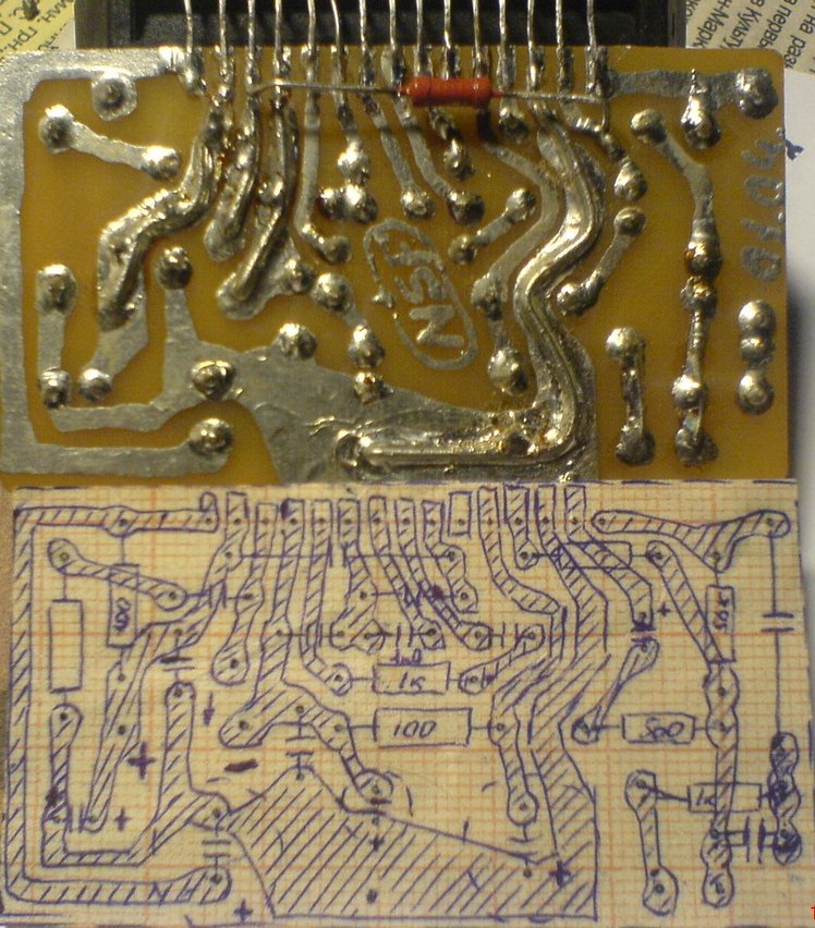 На плате земли раздельные. Силовые , земляные и выходные дорожки усилены медной проволокой. R ООС - припаивается с обратной стороны платы прямо на ножки микросхемы. Делалось в 2003 году - ни "Тырнета" , ни компа не было-рисовалось на "миллиметровке".Нажмите на изображение для увеличения.