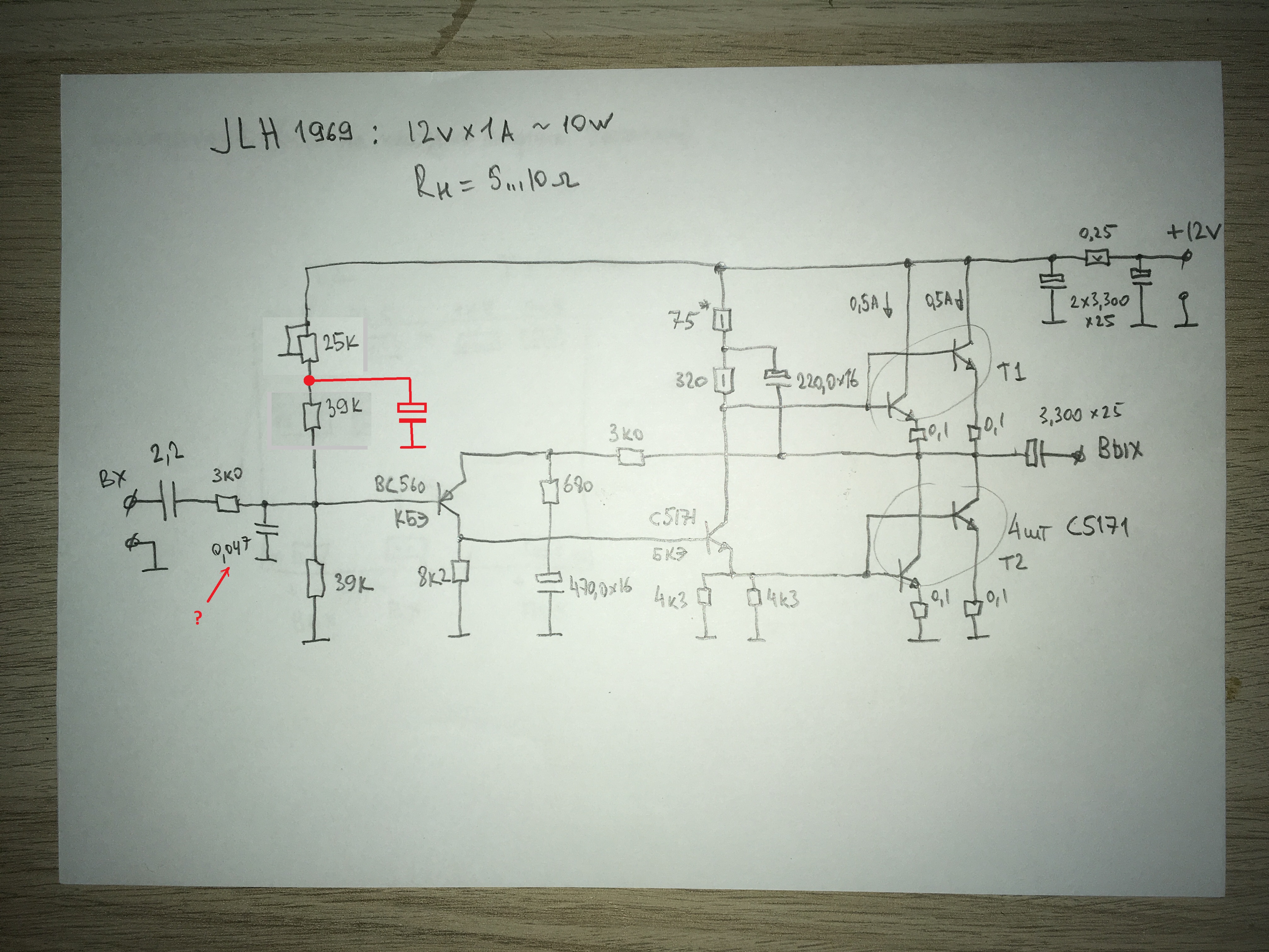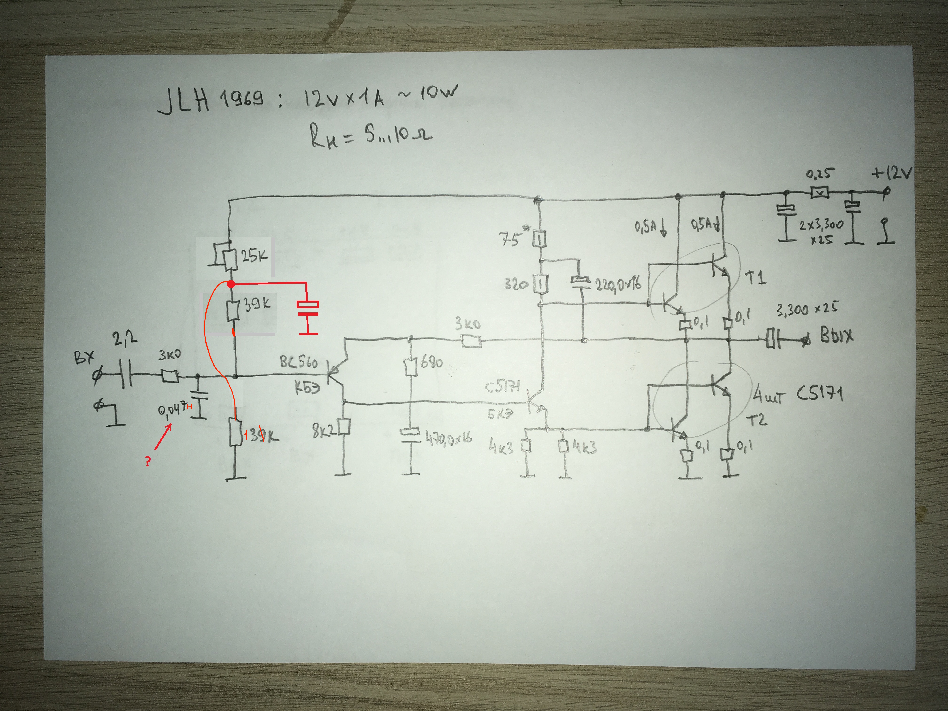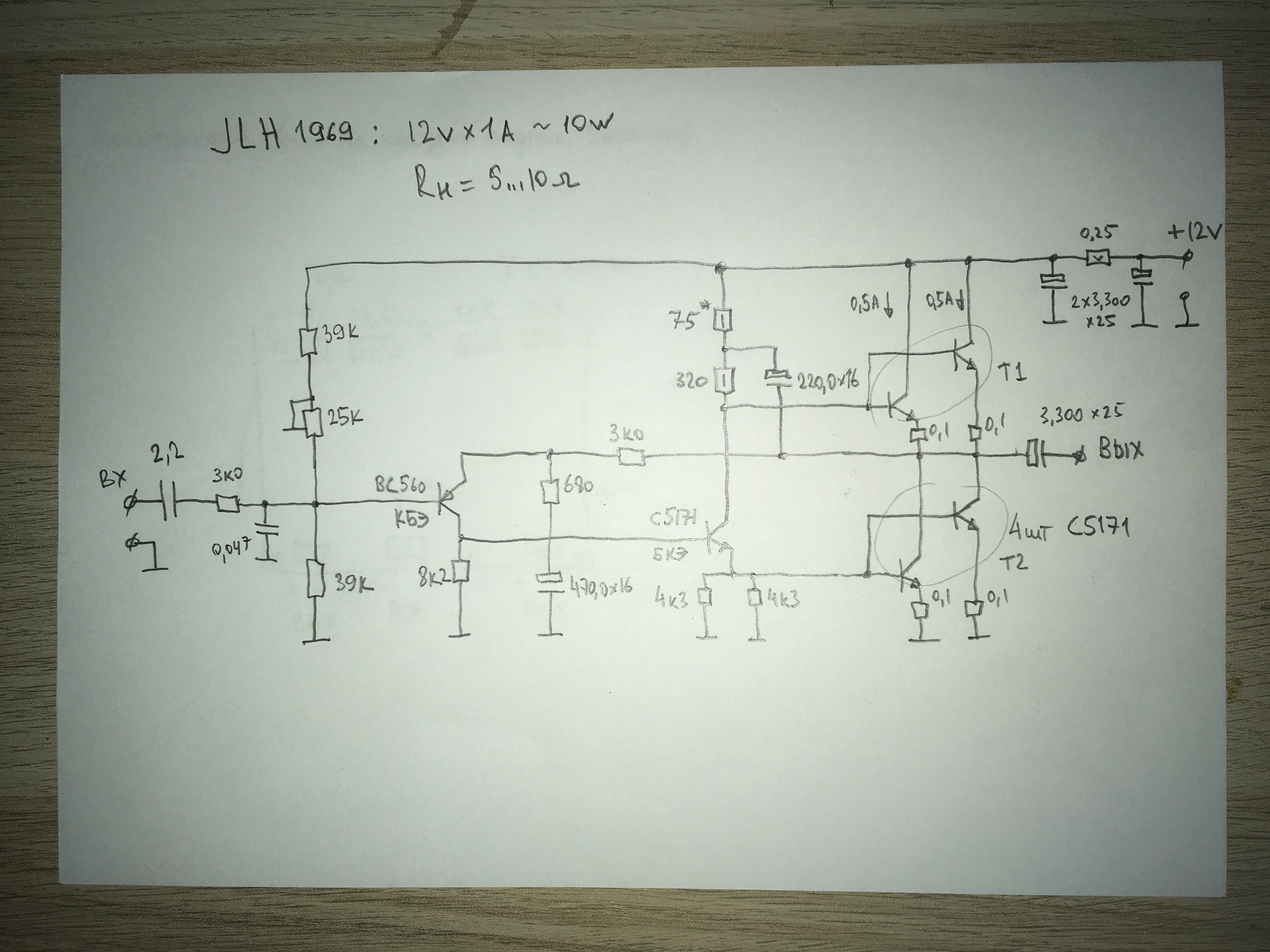 Собрал JLH-69 в качестве пробы для системы "в спальню". Питание +12В, выходной каскад на спаренных С5171, ток покоя по 500мА в каждую пару, в сумме 1А на канал. Измерение h21э у этой партии С5171 показало, что максимум в 200 достигается как раз на 0,5А. С5171 выбраны ещё и потому что им не нужны изолирующие прокладки. Ку выбран = 3, больше мне не надо. Остальные номиналы как на схеме в аттаче. Собрано на "деталях из тумбочки", в основном китай.