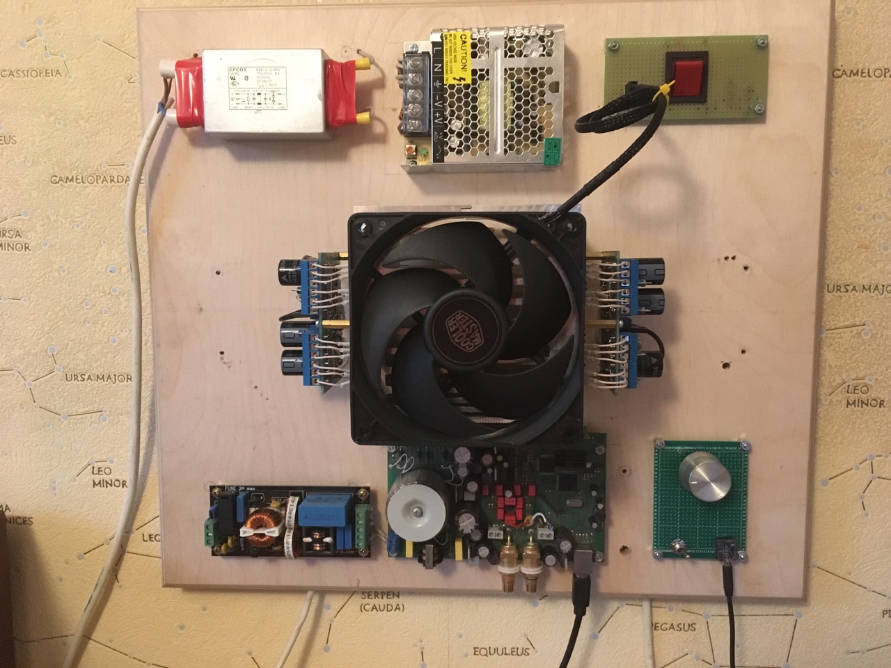 Каждый канал, включая свой CRC фильтр питания, собран на макетной плате 60х80мм и прикручен на ножках к радиаторам над своей четверкой выходников. Вся эта монументальная конструкция размещена на фанере толщиной 12 мм. На этой же фанере сидят все остальные платы (ЦАП, ИИП, сетевые фильтры, коммутация входов, РГ...). Все соединения разведены под фанерой и не оскорбляют взор. Фанера вешается на стену как картина, как элемент модерн-арта. Каковым, собственно, и задумана. Сейчас это грубый макет, но на финише сделаю красиво, покрашу в белый, возьму в багет - будет оригинально и не стыдно ))
