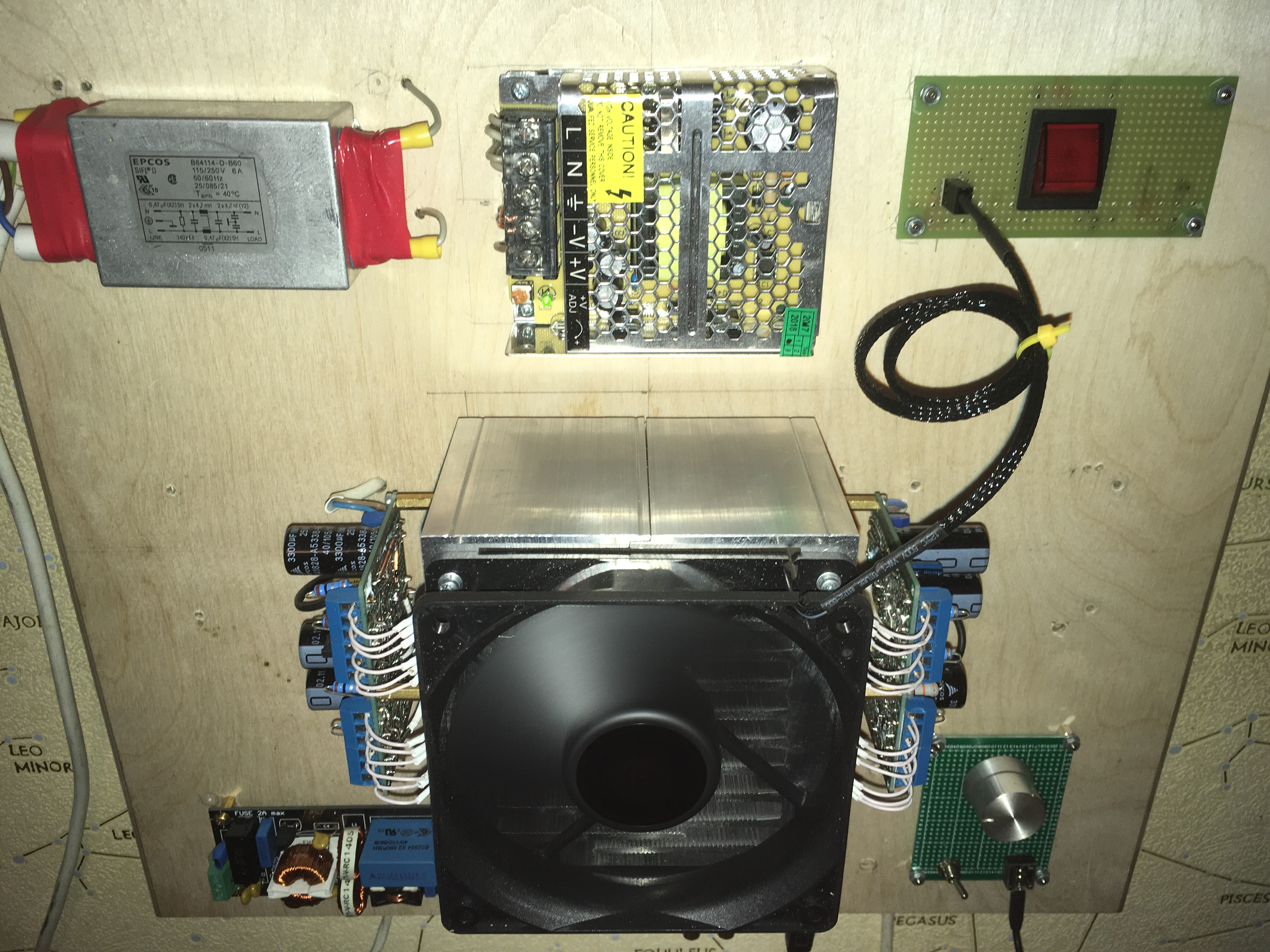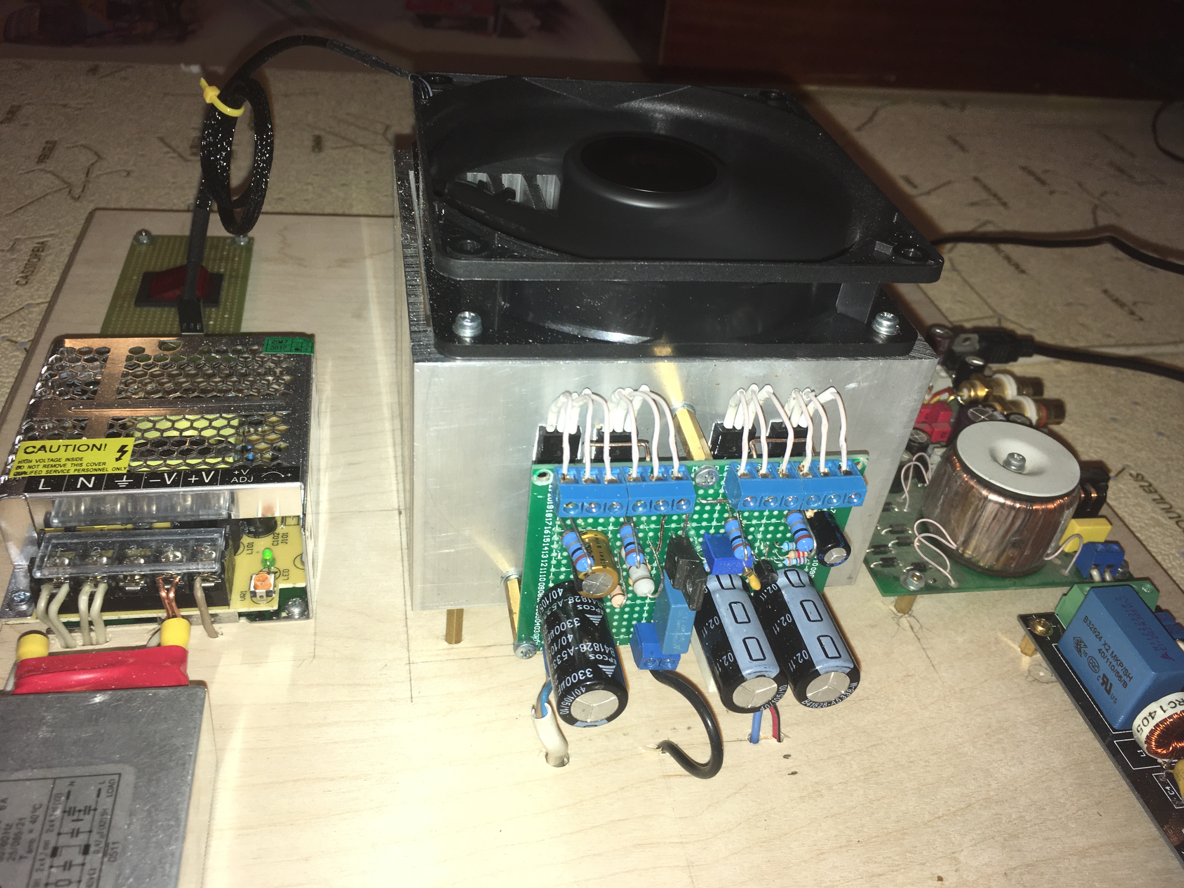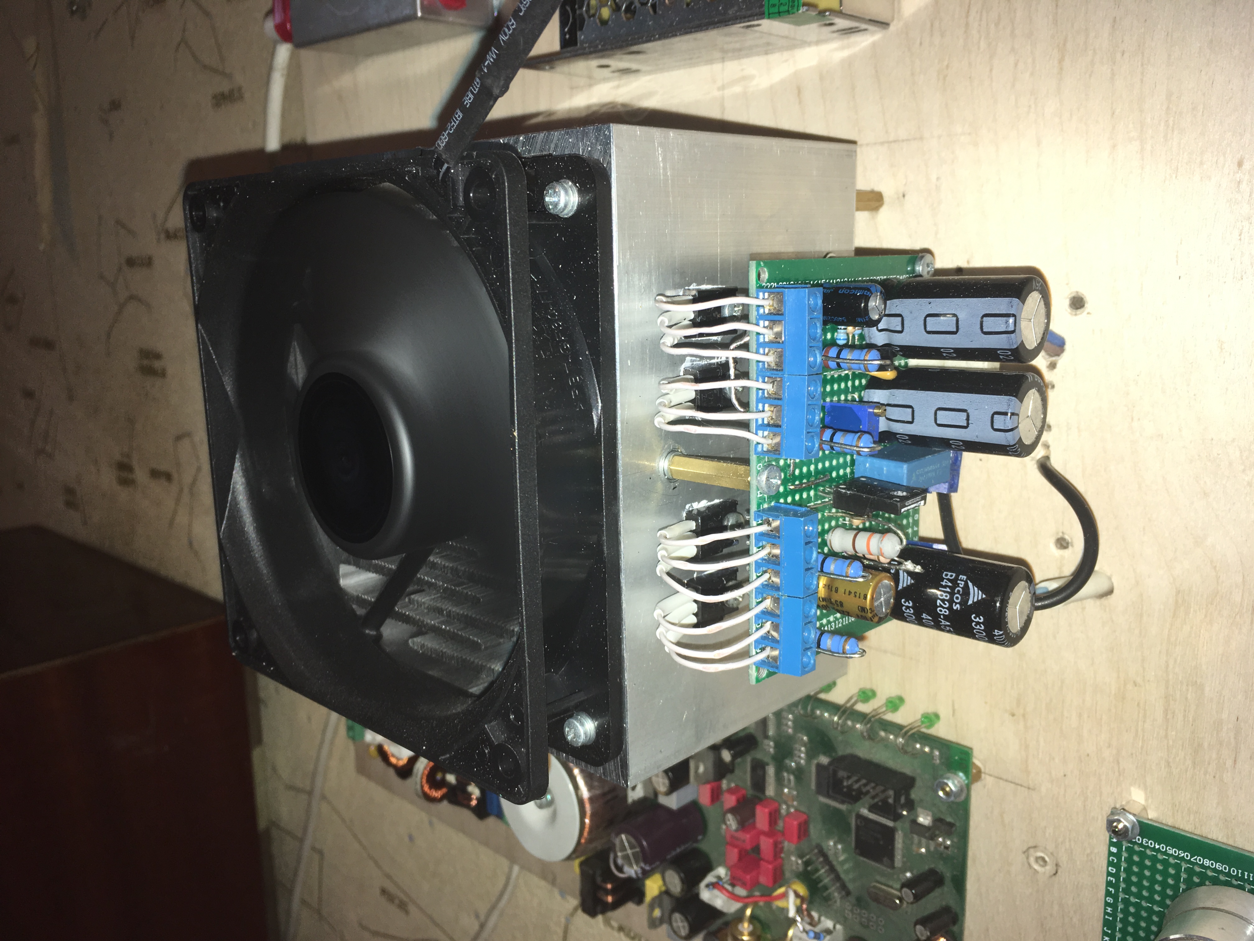 Все 8 выходных транзисторов размещены на радиаторной сборке АВ2311 (см здесь, прокрутить вниз). Сверху радиатора прикручен малошумящий компьютерный кулер 120х120, запитан от 12В через резистор 320Ом. Крутится небыстро и тихо (не слышно с 50см), охлаждает исправно. Температура радиатора не более 30 град с вентилятором и примерно 60 град без него.