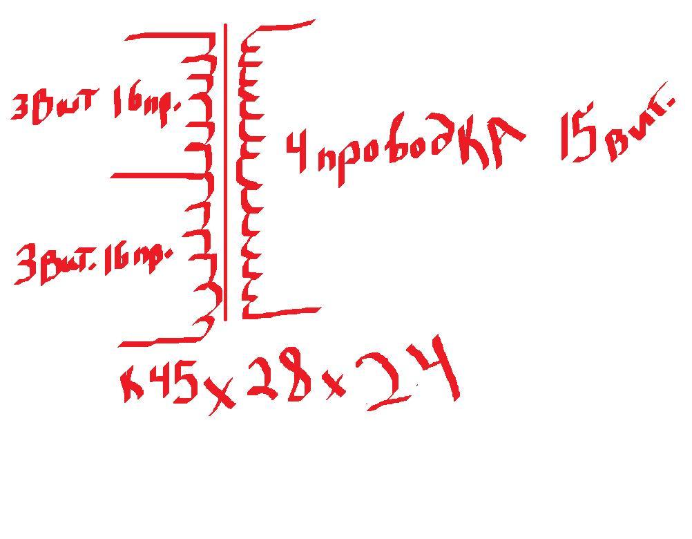 я уще транс намотал от средней точки по 3 витка и по 16 проводков 1мм. вторичка 4провода по 1мм 15витков
