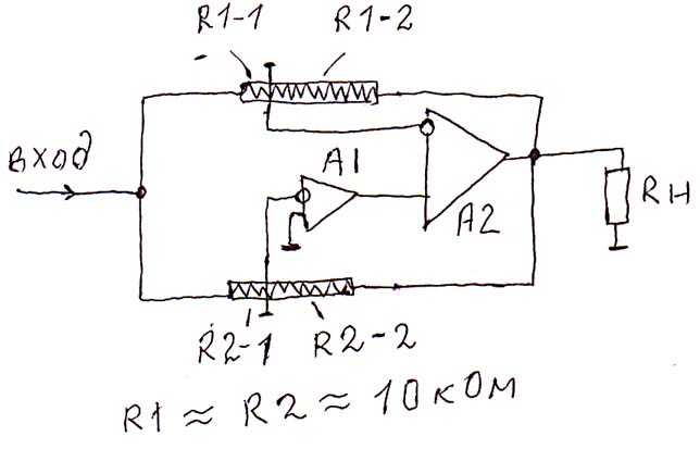 Главное - способ соединения всех этих входов-выходов, соотношение сопротивлений резисторов и свойств А1 и А2 в совокупности должны дать радикальное снижение искажений Uвых.