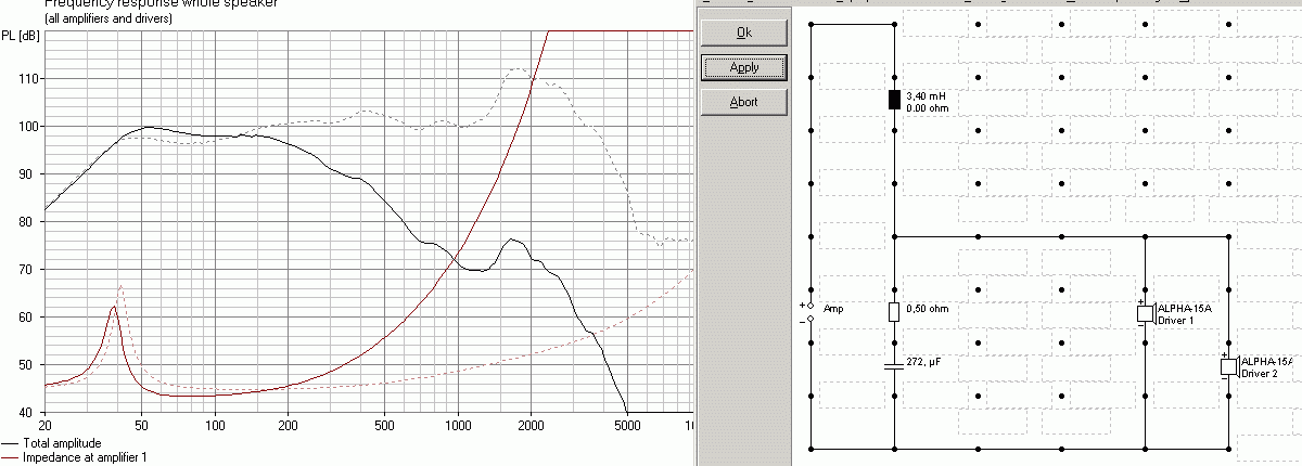 Давайте проще поступим. Я взял номиналы из проекта http://www.troelsgravesen.dk/OBL11.htm. Головка там одна и другая, щит другой, но фильтр посчитан нормально. Не думаю, что влияние бафла породит какую-то невероятную схематику. Я пересчитал v.1 под спараллеленные динамики и получил примерную картинку. Поскольку я не знаю, по какой частоте должно делиться в данном случае, давайте "ползти" к нужному разделу, отталкиваясь от этого клона. Можно под последовательное переделать, это не проблема. Можно средник какой-нибудь сразу прикрутить, чтобы нагляднее было.
