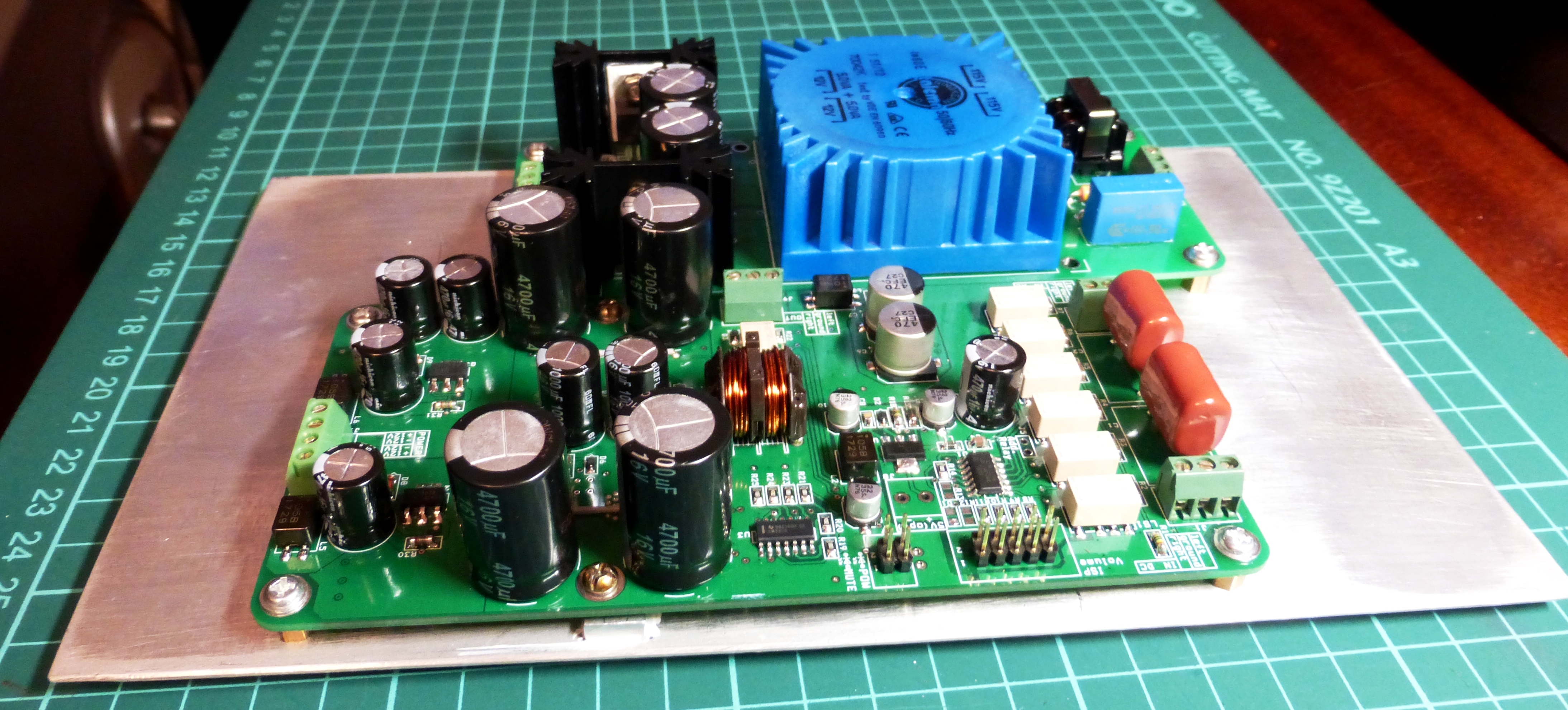 В данной конструкции использовано подключение нагрузки к источнику тока, реализованного на структуре Шиклаи. С целью минимизации потерь на тепло, на плате усилителя установлен только фильтр питания с малым (менее вольта) падением напряжения.