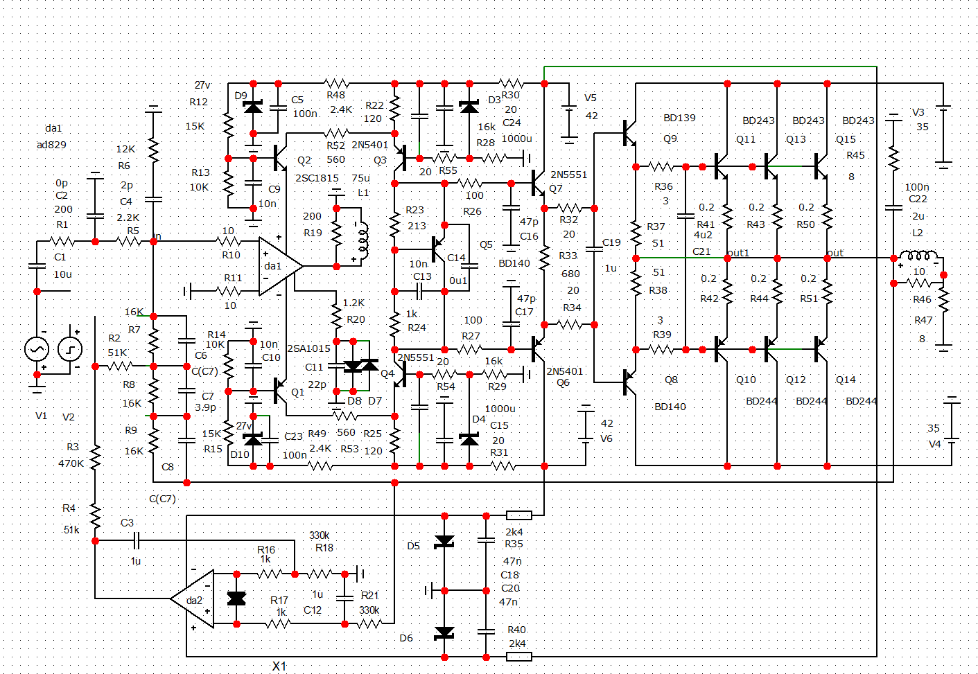 подчистил номиналы в схеме. Кстати никто так и не обратил внимание на тот факт,что в клипе возможна аварийная ситуация с превышением обР транзисторов сдвига уровня с ОБ , да и номиналы делителей в базе этих транзисторов явно завышенные.В железе не прокатит. Ну и вишенка на тортике двухуровневое питание 42/35вольт .Попробую разводить.