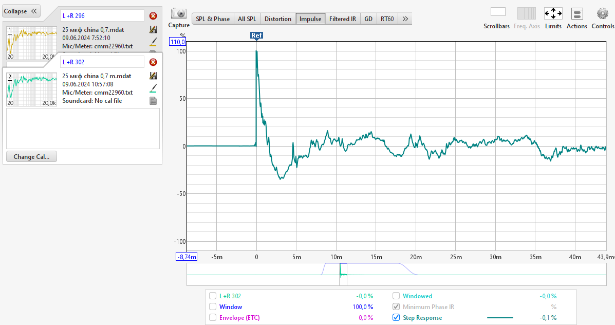 На 150 Гц фаза уходит на 120 градусов. С соответствующей реакцией на АЧХ. На АЧХ выше 2 кГц до 10 дБ расколбас.