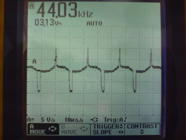 Судя по осцилограммам у тебя частота 44кГц.Комповый на такой же частоте работает.