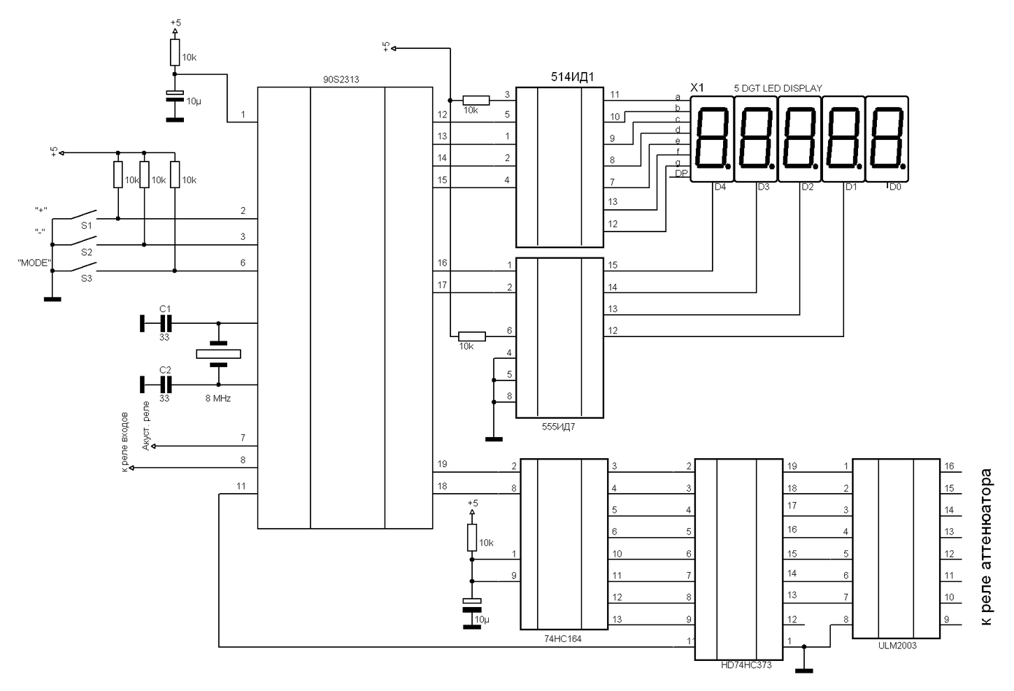 Вот схема регулятора громкости на AVR с селектором входов. ДУ нет, но при необходимости реализуется легко, один вход зарезервирован. Выдает семибитный двоичный код, возможно переключение двух входов (просто больше не нужно было). Начальные уставки запоминаются в EEPROM.