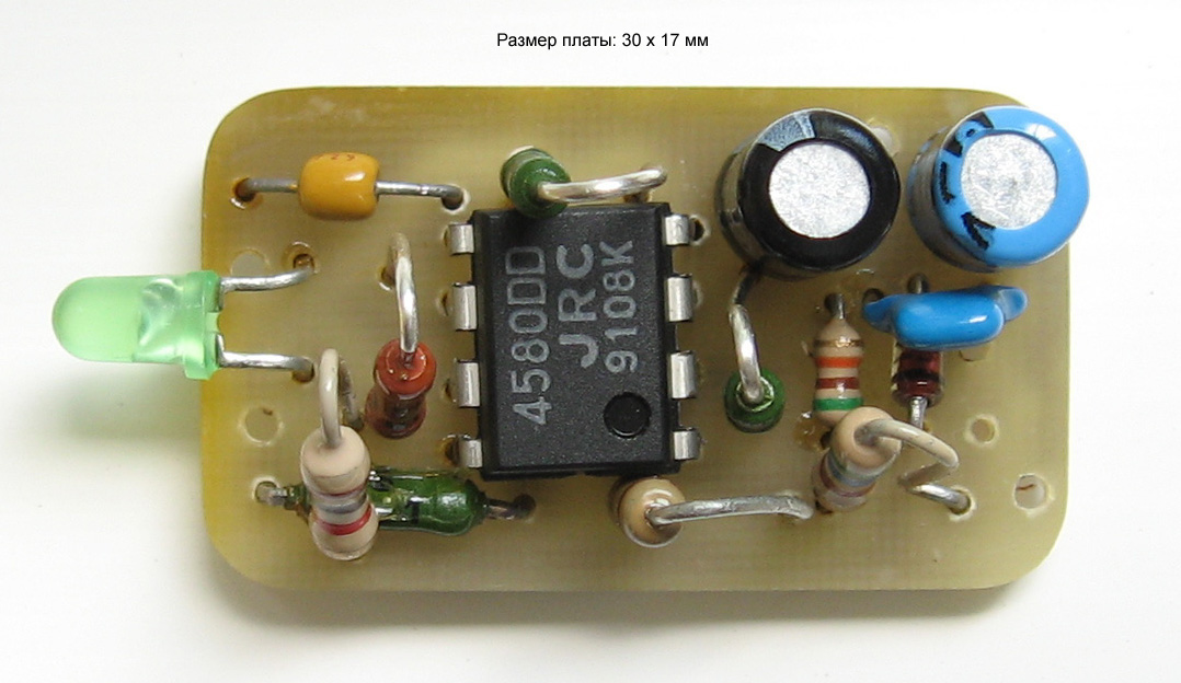 Конденсатор по питанию можно переместить непосредственно к входным пятачкам платы (как я и сделал, потому что плата вставлена в корпус от щупа вольтметра - теперь это корпус микрофона , и конденсатор мешался). Второй кондер рядом - неполярный электролит для развяски ОС по постоянному току можно отогнуть (если оставить длину его ножек над платой 2мм) и он не мешает.