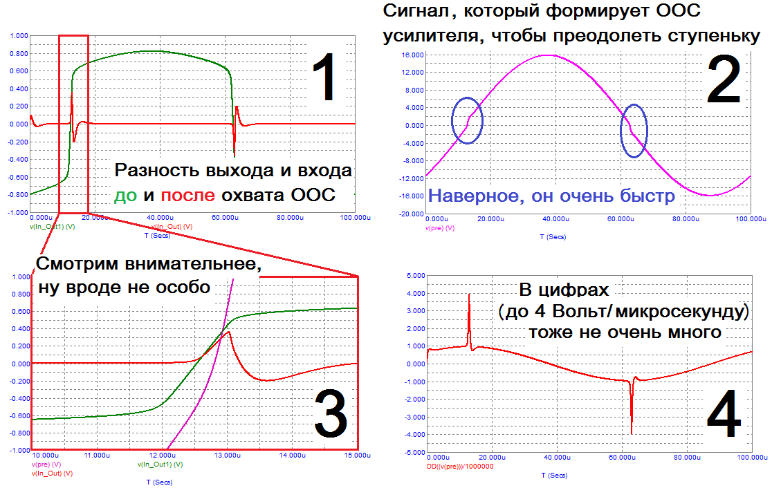 А вот в ООСной схеме (красное), выходной сигнал будет практически идентичен входному, за исключением той самой злосчастной ступеньки (красное).