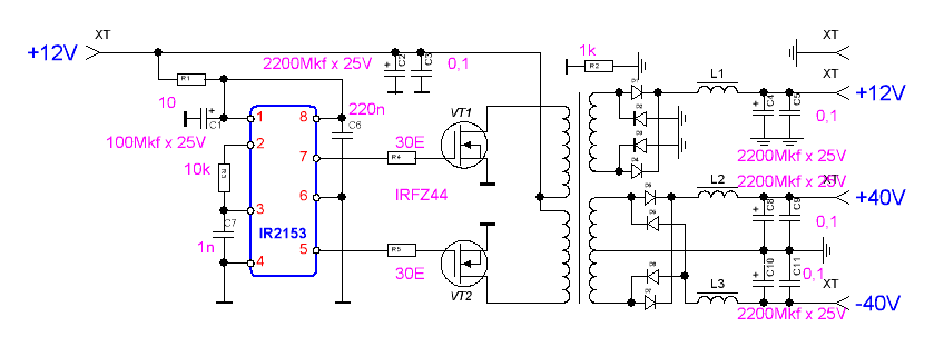 Кстати очень хорошо работает. Если не нужна обратная связи и дополнительные заморочки уставшего мозга то эта схема на IR2153 то что надо. Только будет стоить как 3-4 TL494. Зато обвяз минимальный, работает устойчиво, дополнительные драйверы до 300Вт не нужны!