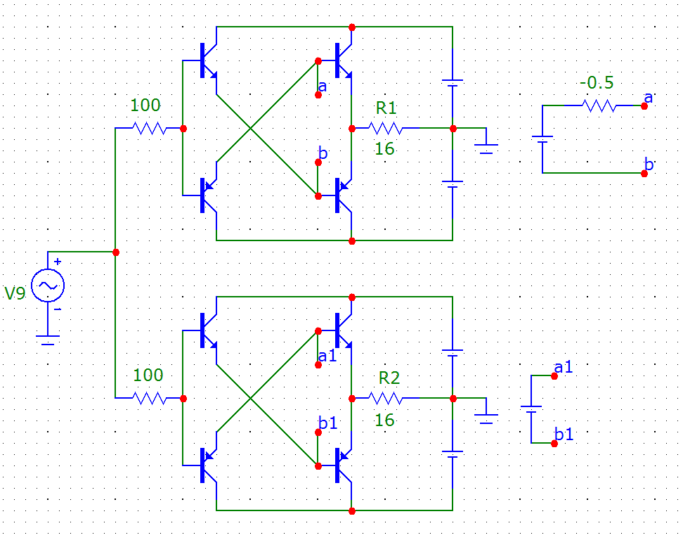 У Алёшина , кстати , там вообще извращение ... там , насколько я помню - в эмиттерных цепях выходников стоят резисторы , шунтированные диодами . В результате , на малых токах ( в покое ) эти резисторы помогают стабилизировать режим , а на больших токах - диоды открываются и шунтируют резисторы , чтобы уменьшить потери .... ИМХО , полный абсурд Ведь кривизна характеристики каскада от этих переключений только возрастает .... так , по идее , лучше уж тогда на чистый класс В перейти