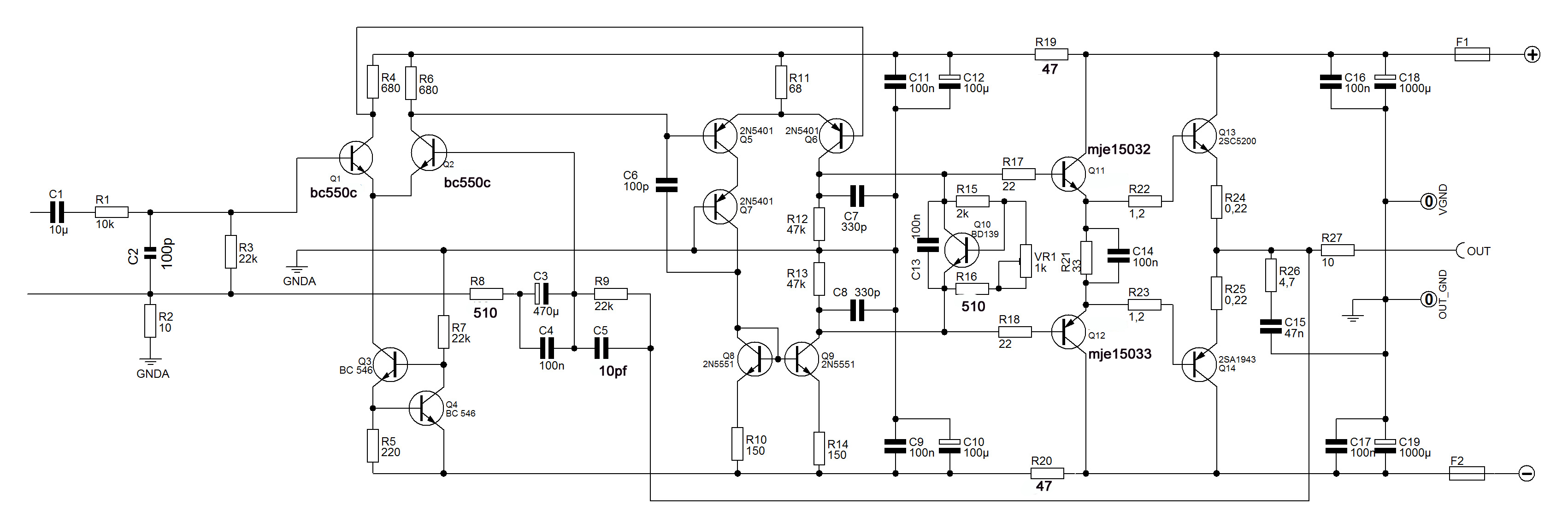 Резисторы R31\32, в схеме как R19\20 сначала поставил 22Ом, теперь пробовал и на 47 Ом, транзисторы все равно греются и опять ноль реакций на настройку, выходники стоят 2SC5200\2SA1943
