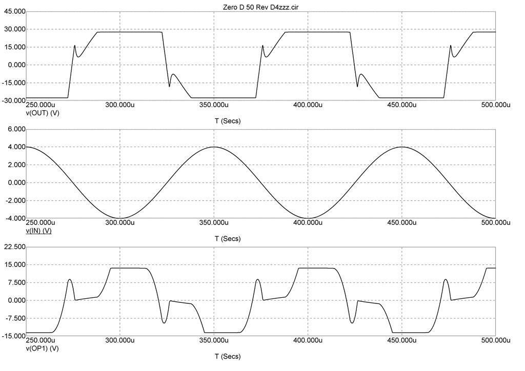 В схеме ZD-50 наглухо перегруженный по выходу первый ОУ ещё некоторое время выходит из этого состояния, плюс большая инерционность выходного каскада всё это усугубляет.