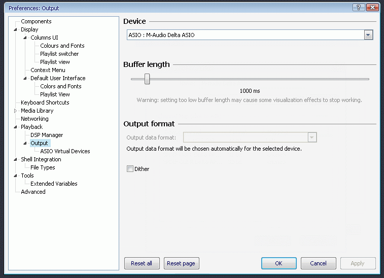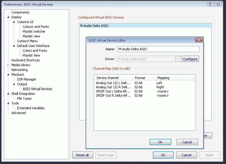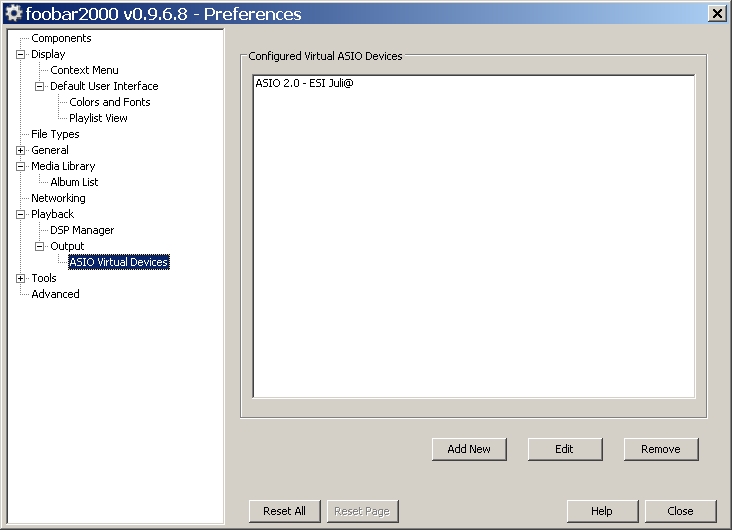 3. Запускаем Foobar. Далее жмем «File -> preferences -> playback -> output -> ASIO virtual devices -> Add new -> ASIO4ALL v2-> Save all, close».