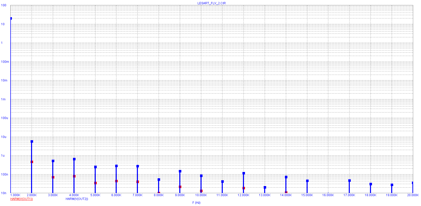 Спектр искажений для схемы поста #280 при 1 кГц\20 В\8 Ом (синим - как есть, красным - с заменой резисторов R4,5,6,7 источниками тока).