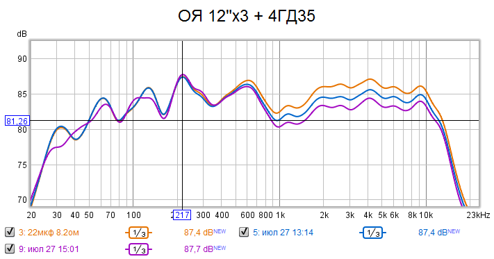 Значит конструкция была немного изменена. На СЧ звене стоит Бейма 605Nd, пропитанная пропиткой Воробьёва, за что огромный респект, не верил что станет лучше. На верхах стоит Бейма СР21. Нч соединены паралельно, соответственно сопротивление 4 Ом. Фильтра первого порядка. НЧ - катушка 3.9 мГн Монакор, СЧ - конденсатор 60 мкФ и резистор 14 Ом, ВЧ - 1мкф и резистор 13 Ом. Выкладываю суммарные графики АЧХ и АЧХ Альфы в ближнем поле. Очень громкий звук достигается при амплитуде сигнала 9 Вольт. (Это уже дребезг дверей, и как бы уже хватит в любом состоянии).