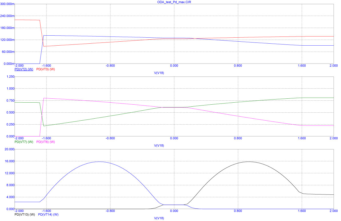 P.S. Вот пример, как в DC анализе посмотреть максимальные мощности рассеивания на элементах усилителя. Т.е. здесь представлены зависимости рассеиваемой мощности от входного напряжения схемы, которое в данном случае линейно меняется от -2 до 2 Вольт. Интервал выбран с запасом, чтобы можно было посмотреть на реакцию усилителя при перегрузке.
