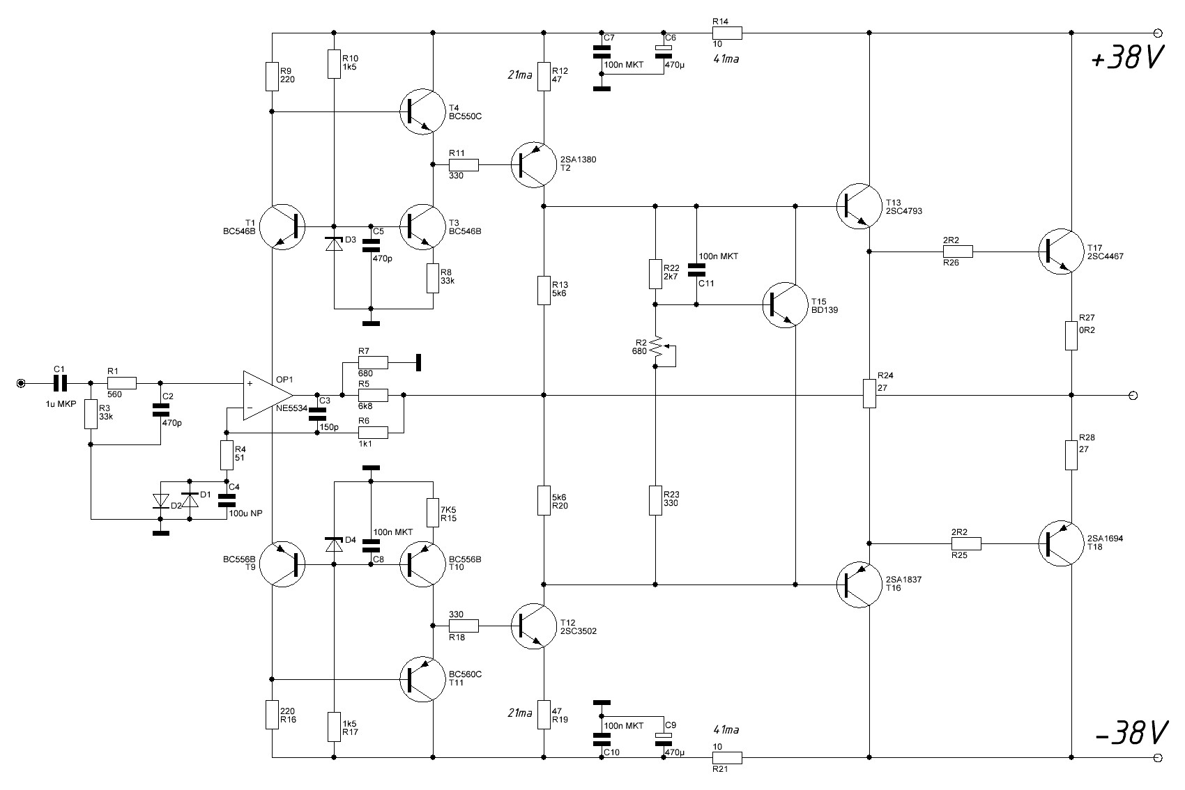 Схему рисовал поздно вечером и забыл поправить номиналы, на плате всё верно R27=R28=0.2Om, R8=7k5, C5=100n. Буду значит еще раз перепроверять цоколёвку. Первую я ошибку уже находил. Доверился печатной плате и наоборот попихал ВСшки, потом опомнился, но усилитель также само себя и ведет. Питание на ОУ верное +/- 15В. Ток покоя регулировал от 0 до максимума.