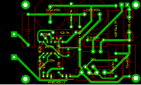 fobos, Возможно какраз из за неудачной разводки платы она и не работает, у меня тоже 62к 1вт это сопротивление но напряжение на микрухе 15.5в. Так что лучше сделай плату которую я выкладывал последнюю. Без транса его тоже лучше не включать тк полевики будут моментально нагреваться.