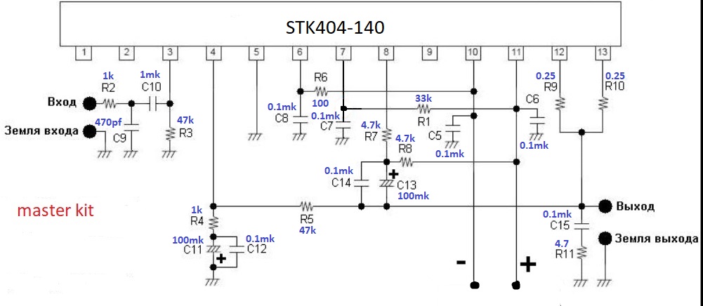 Купил мастер-кит STK404-140, собрал, трансформатор 250 ватт, в фильтре питания 10,000мк на плечо, питание +63\-63 (максимальное по datasheet).