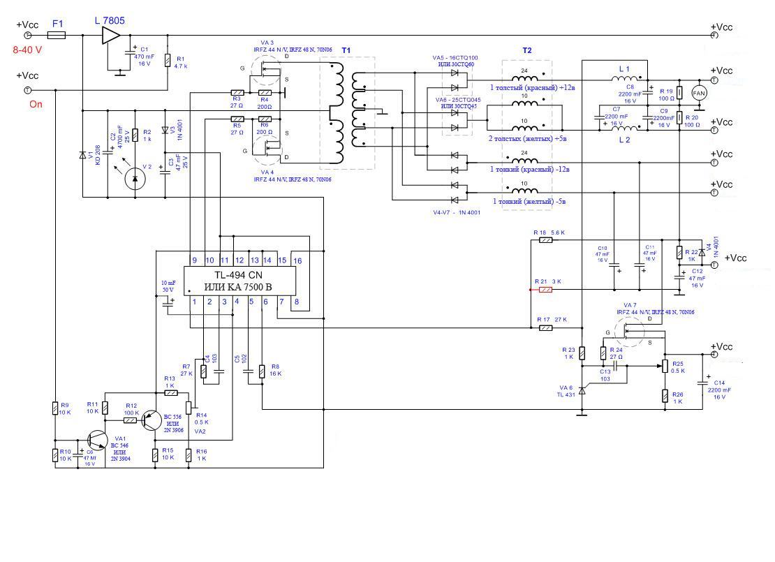 Схема отлично работает,это известный БП Сергея Лебедева (Лайт версия)на сайтах по авто компьютерам.Он отлично работает от 8 до 14 вольт в легковых авто.Мощность всего-то требуется 100 вт.