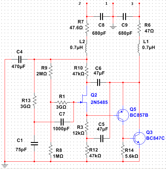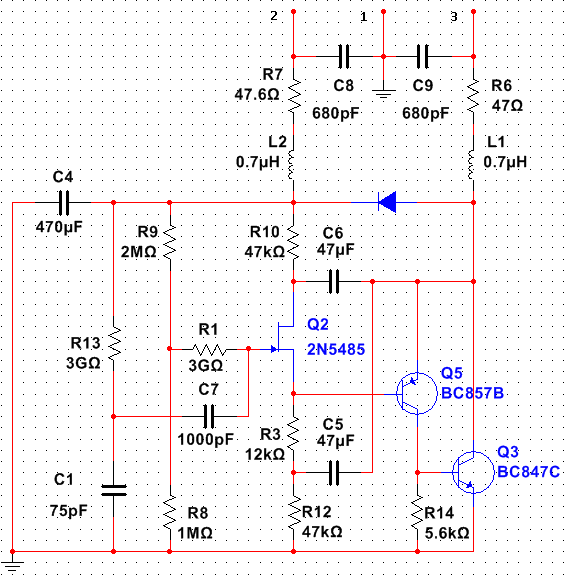 Возможный вариант с заземлёнными входными сопротивлениями. Надо попробовать с диодами "3 pA" вместо гигаомников. И вроде схема позволяет подстраивать ток входных jfet без краха режима. 2SK3557(6) когда-то нам показывал нулевой ток затвора в определённом режиме. Будем испытывать. Симулятор, по умолчанию и к сожалению, в этом ничем не может помочь.
