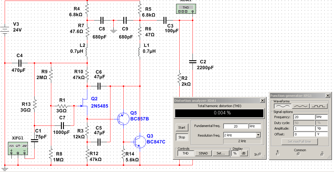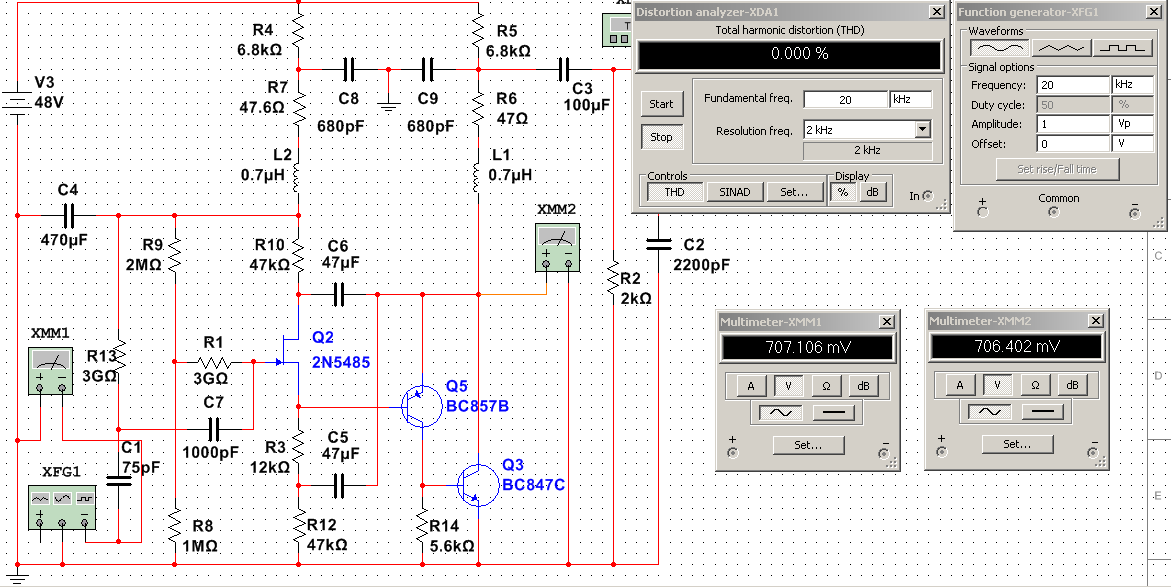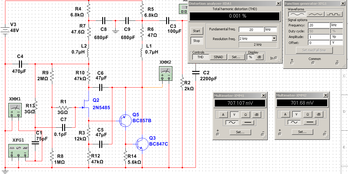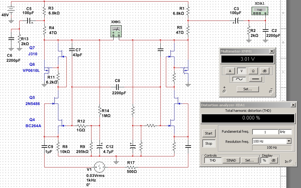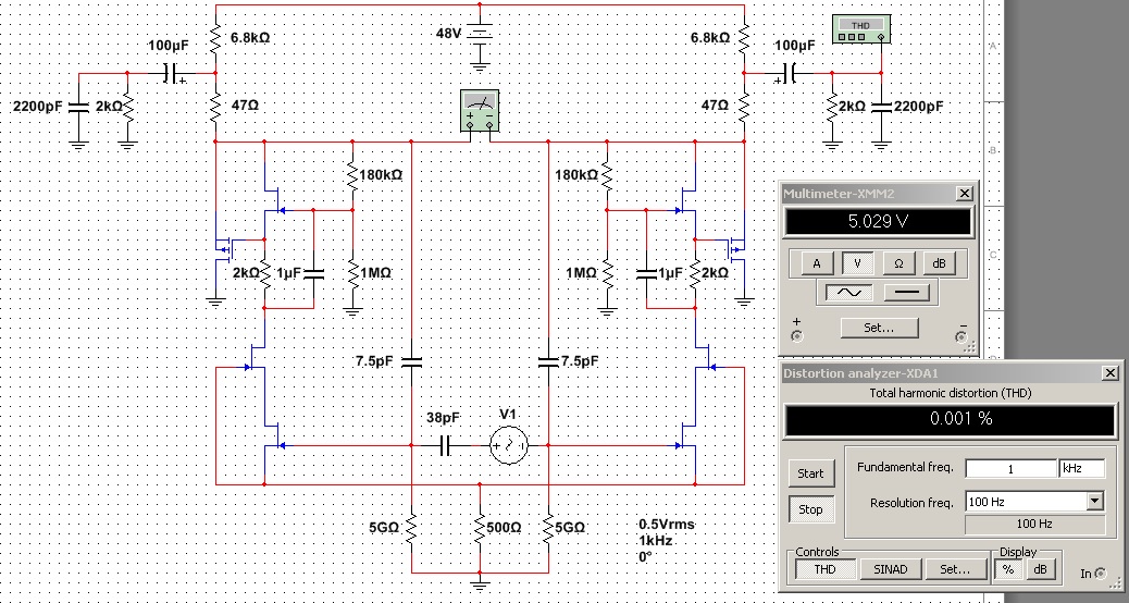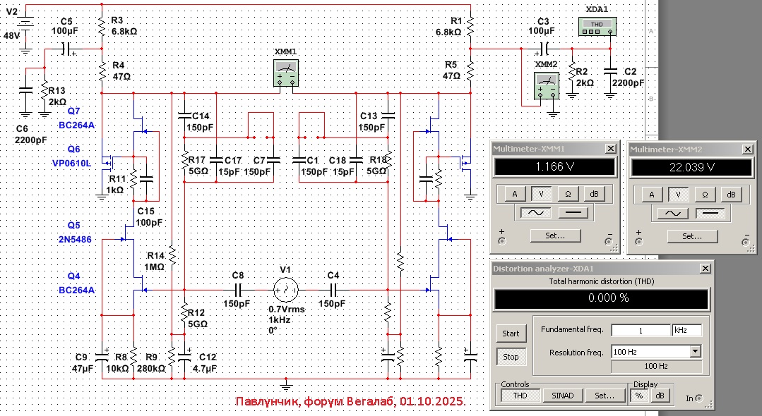 Схема, сама по себе, достаточно линейна даже при значительном снижении напряжения питания и превосходно линейна от 40V вплоть до 60V.