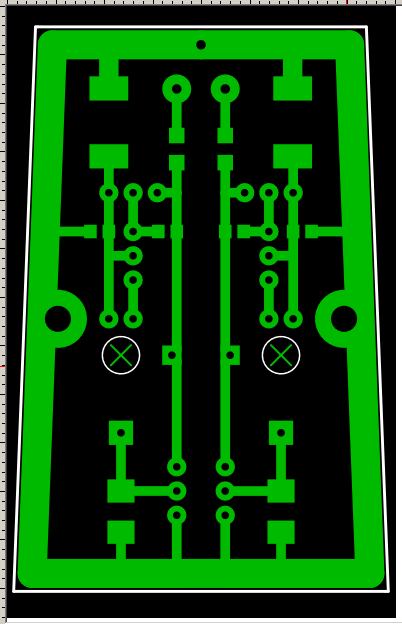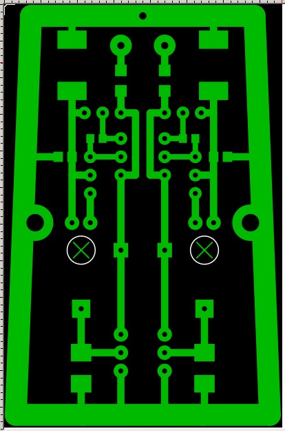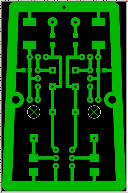 Размер чёрного поля 40x63 мм. Сама плата около 38.3x57.9x33.8 мм. Расстояние между крепёжными отверстиями 29.5 мм, а их диаметры по 2.7мм. Отверстия для навесного монтажа входных узлов (отмечены крестиками) по 4 мм. В отверстие, в подвешенном состоянии, пропустятся по одному выводу от трёх элементов - конденсатора ООС 10-20 пФ, сопротивления 1-5 Гигаом и затвор входного полевика. Все три вывода скрутить вместе тонким медным проводом с обратной стороны, спаять, создав таким образом крепкий изолированный от платы контакт для подпайки проводов идущих от капсюля.