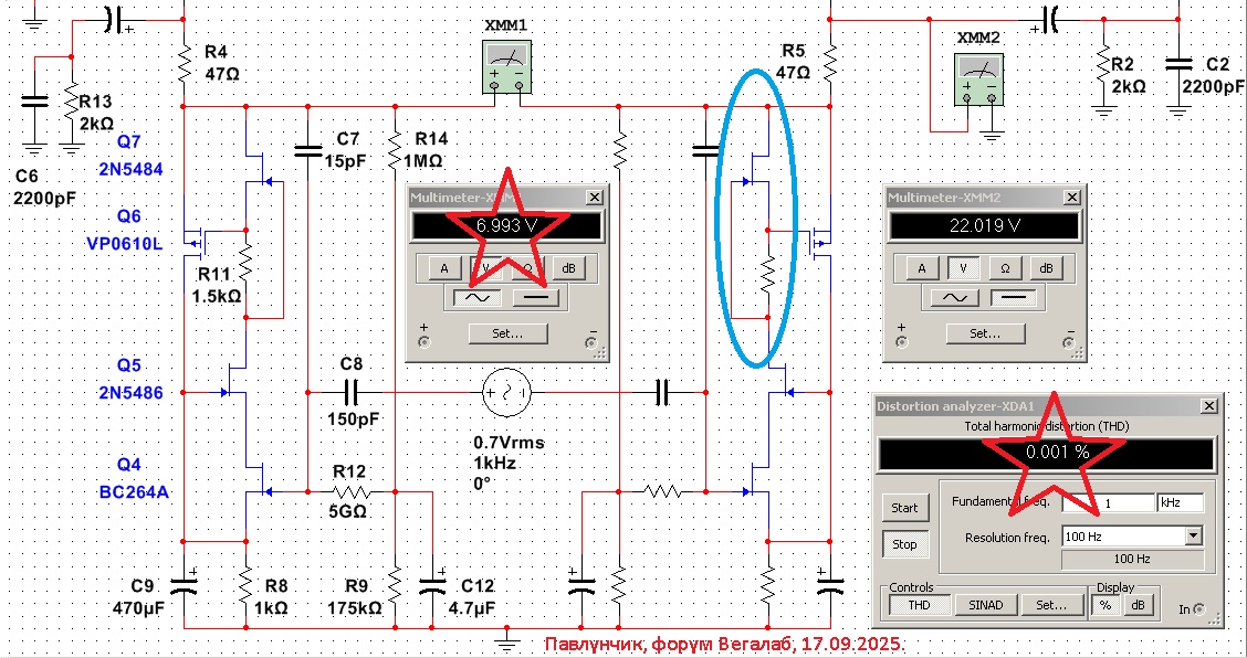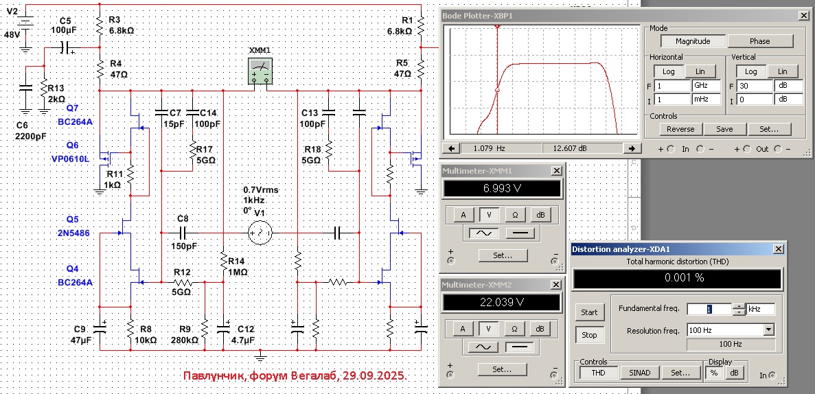 Вот так сравниваю различные входные jfet по шуму, контролируя режим по постоянке (на всякий случай). FINшBCB2. Ток СИ фиксированный, задирать более 0.7 мА не рекомендую. Здесь самый малый шум у 117, 3557(6) и, чуть хуже- К30.