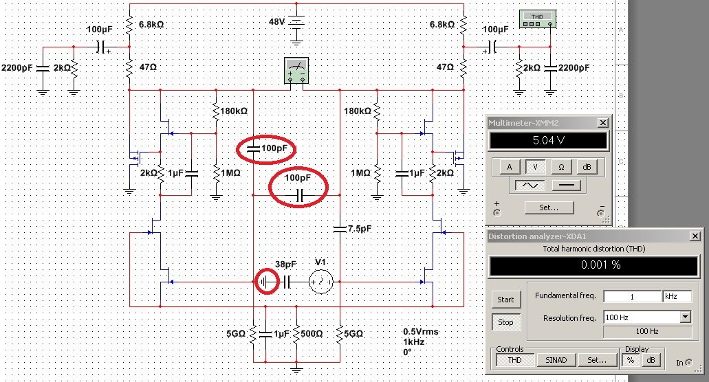 Тест - эффективность компенсации паразитной ёмкости входа (сигнал подаётся на вход через очень малую ёмкость - 0.1 пФ). Как это отражается на КНИ и коэффициенте передачи -