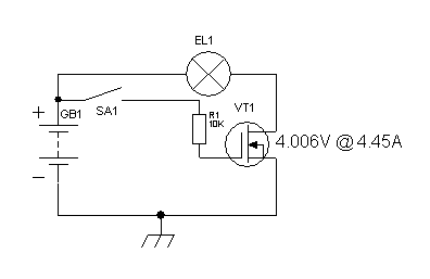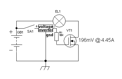 Далее. Испытывал транзистор по-всякому и пришел к включению, показанному на рисунке. Избавился-таки от немереного падения 4В на транзисторе путем смены полярности управления. Теперь падение уже даже не 300, а 196мВ при токе 4.45А, что в точности соответствует табличным данным, 44мОма. Как вам такое включение?