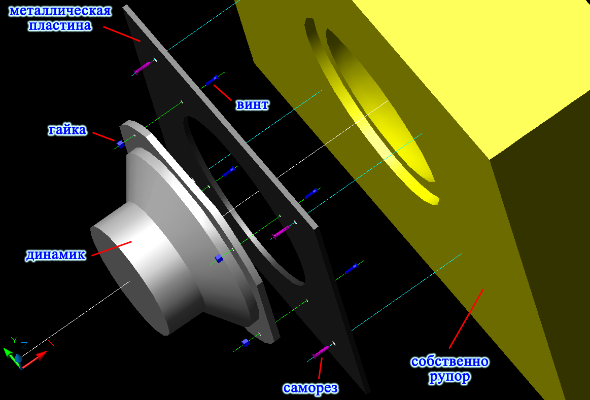 Normann, я тут нарисовал, как себе представляю крепление динамика к собственно рупору. Подскажите, каким образом это лучше сделать. СтОит ли, например, увеличить количество саморезов, которыми металлическая пластина крепится к собственно рупору или место их установки?