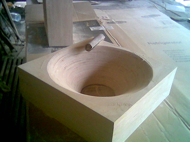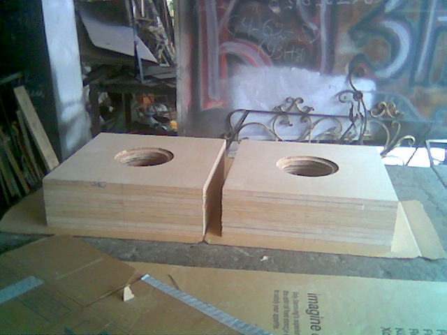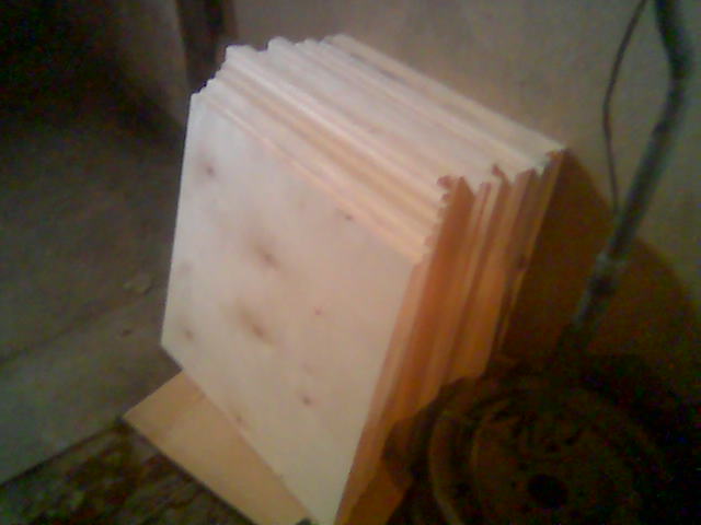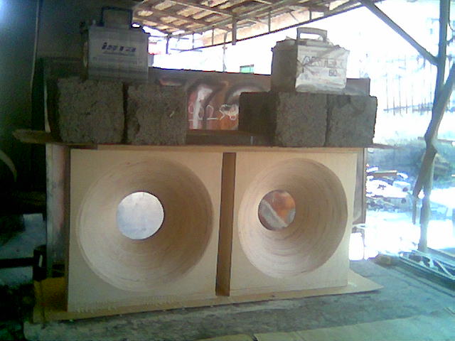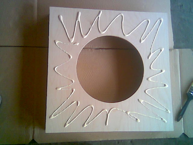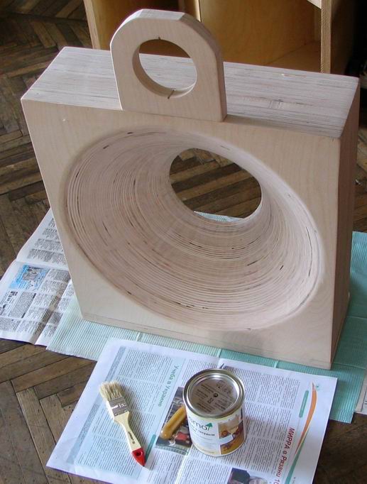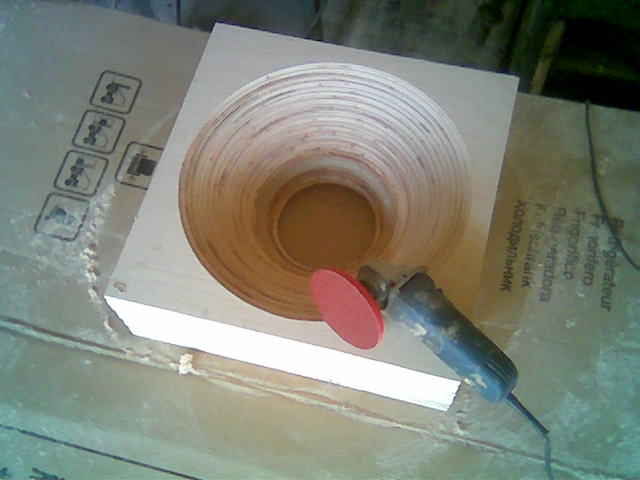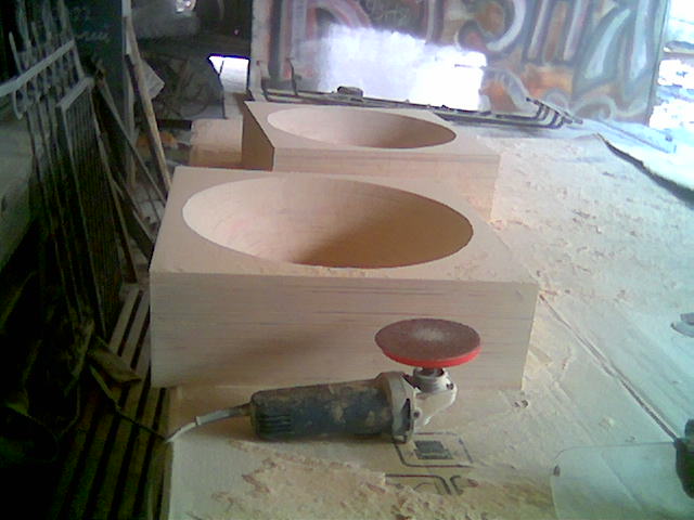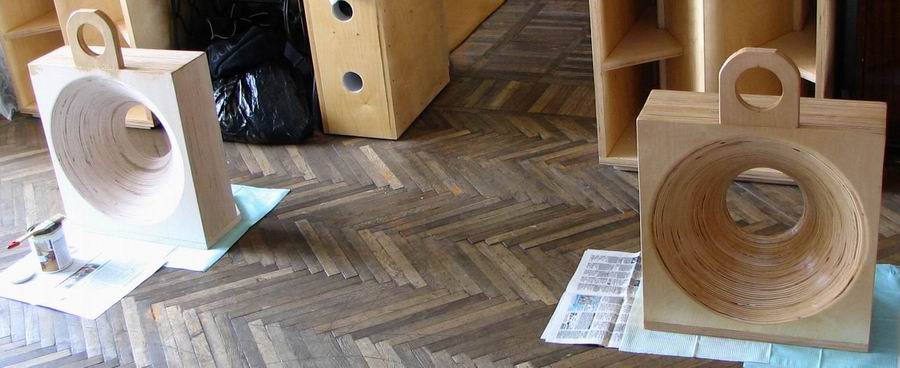 Сегодня часа полтора натирал изделие наждачкой, потом надоело. Подготовил подставки из 24 мм фанеры и приклеил рупоры к подставке.
