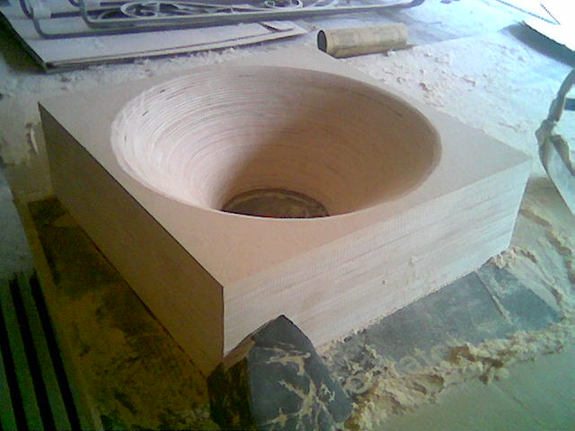 Обязательно смимите получившуюся кривую огибающей рупора, сравните с чертежом. Кроме того выточите вставки разного размера (вплоть до "нулевой") для заполнения объёма предрупорной камеры. Сначала пробуйте эксплуатировать с "нулевой" вставкой. Если в процессе эксперимента камера понадобится (для некоторых видов "ярких" ШП - Fostex FE206E, Lowther DX-EX серий, TFK,...), то я всегда заклеиваю её полоской войлока подходящей ширины.