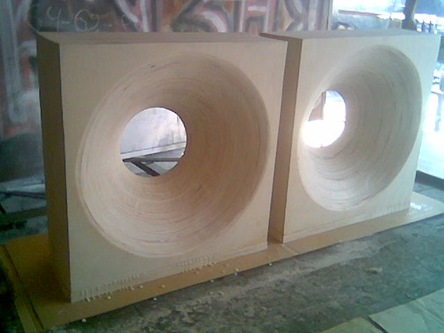 Предыстория такая: в конце октября 2007 мной была создана ветка на данном форуме, где обсуждалась конструкция рупорной низкочастотной секции. В конце января 2008 басовые рупоры были построены. В связи с тем, что после создания рупорной НЧ секции у меня появилось желание попробовать собрать рупорное оформление и для СЧ секции, я начал потихоньку искать возможные варианты проекта среднечастотного рупора. Здесь я наткнулся на интересный вариант наборного рупора под 8 дюймовый динамик. Поначалу эту конструкцию для себя отверг (посчитал, что слишком много надо материала). Как-то ночью пришла в голову идея, что если бы подобную же конструкцию можно было бы собрать из панелей размером не 600х600 мм, а 500х500 мм, то в этом случае можно было бы обойтись всего двумя стандартными (1525х1525 мм) листами фанеры (на оба рупора), причём отходов будет минимум.