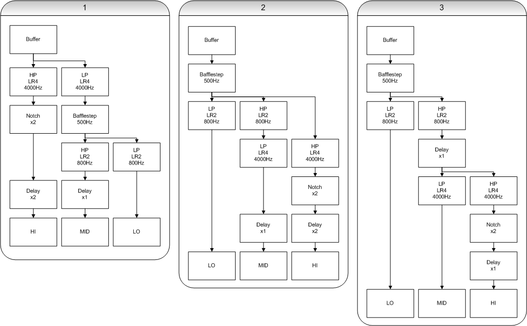 - Общий баффлстеп у СЧ/НЧ, отдельно от ВЧ. При изменении уровня баффлстепа придется перенастраивать уровень ВЧ.