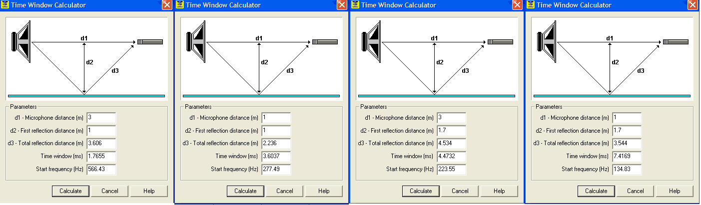 Ярослав, тут Вы совершенно ошибаетесь. Этим всем софтинам абсолютно всеравно на каком расстоянии микрофон. Просто уменьшается окно до первого отражения, соответственно, увеличивается частота, с которой что то видно. Максим, на сколько я его понял, измеряет, в основном, с 0.5м, я все гоню с 1м, у меня потолок 3.5м. Цепляю картинку с калькулятором окна из ЛАБа.