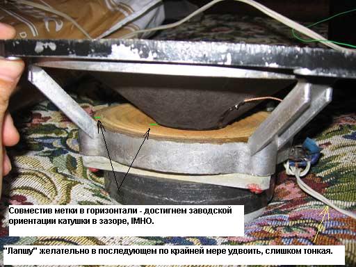 Но Вы купили новые подвес и центрирующую шайбу, поздравляю. Вклеивайте их на место! Потом (не приклеивая) одеваете на корзину, поддеваете центрирующую шайбу с краю, и в образовавшуюся щель засовываетет черный фломастер с тонким грифелем... И прочерчиваете тонкую линию на проводе звуковой катушке в месте верхней грани фланца магнитной системы.