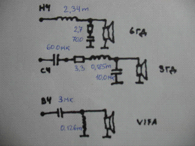 Вот схема фильтра. Все было много раз переделано, в нч, сч стоят электролиты frolyt, по звуку доволен, на работе достал работали с 71 года а емкость 120-140 мкф! открыл один, он совершенно свежий! катушки от каких то старых советских колонок провод 1.2 мм нч катушки с сердечником как раз влезли пластины от ТВЗ, провода меньше ушло да и мощность небольшая, можно на сердечнике. вч мбго и к73-17, дешево и сердито короче говоря, сегодня слушал козлинное сопрано radiohead придратся не к чему! Проигрыватель onkyo7355 усилитель tda 7293 с т-оос.