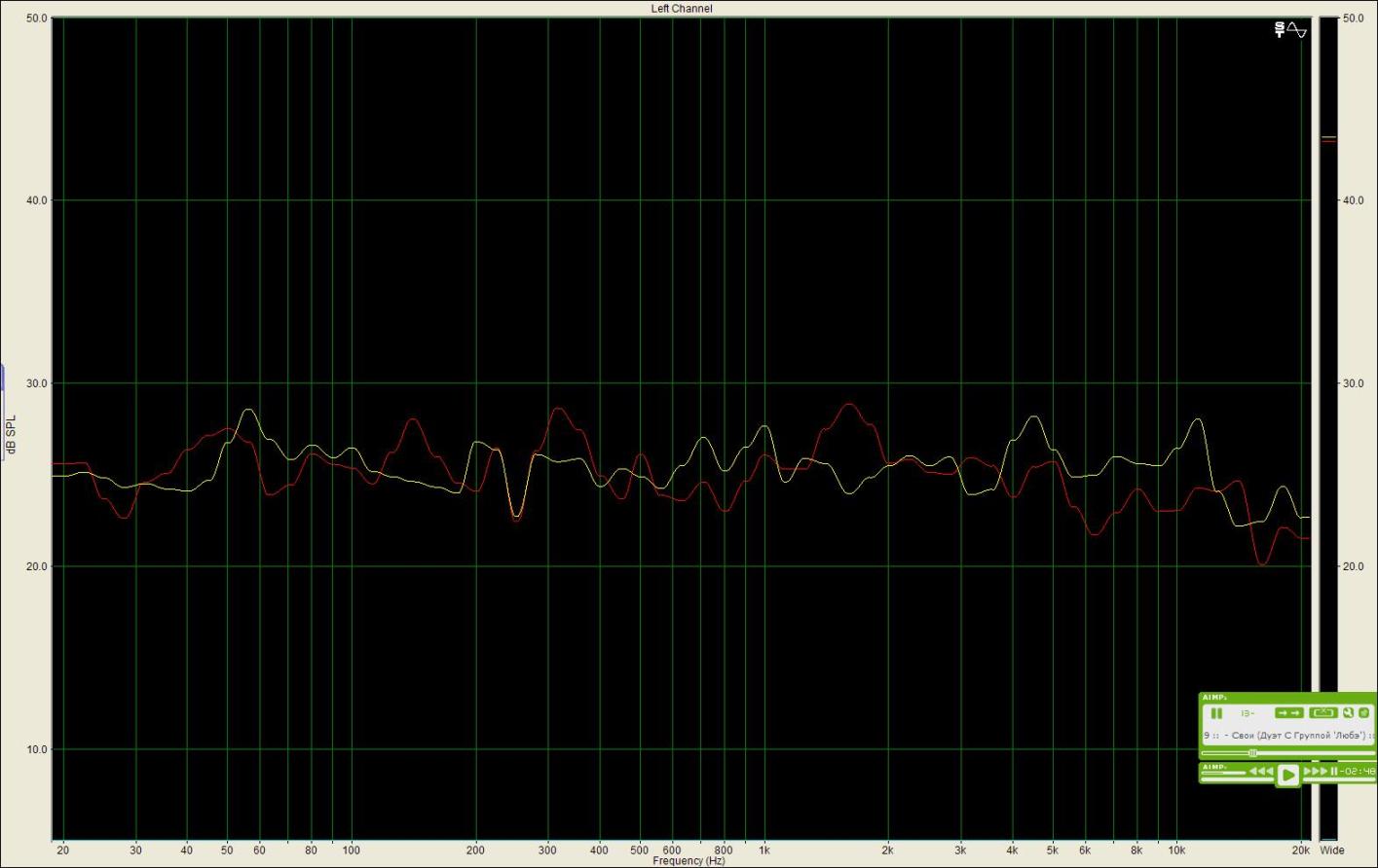 АЧХ сняты по методике Александра Клячина качающимся микрофоном с помощью программы SpectraRTA. Микрофон Panasonic WM-61A.