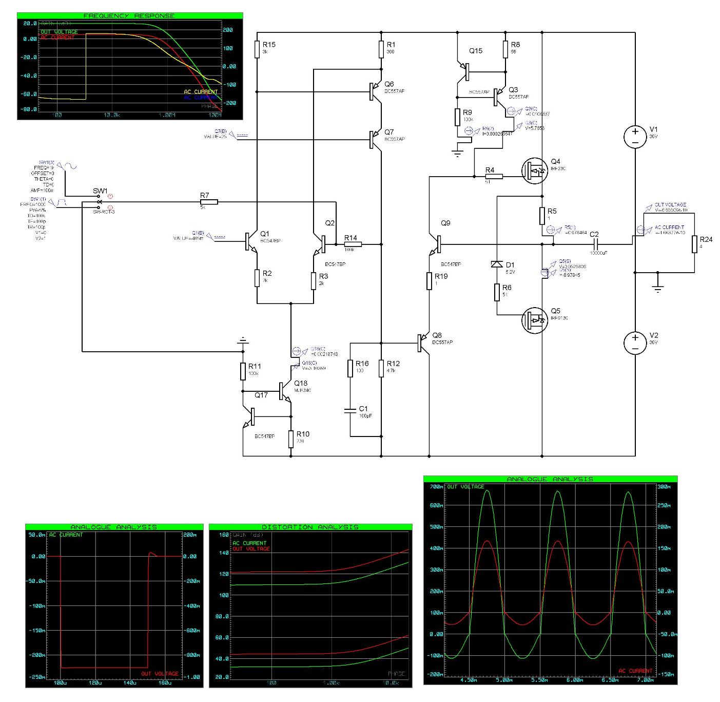 В варианте схемы с ОС и одним дифкаскадом, при разомкнутой петле ОС(нагрузка 10 кОм в землю+источник тока на 6 мА к минусу), при выходном сигнале 10 В, добился искажений 0.02%. Странно, она не должна быть такой линейной, во всяком случае я не верю что верхний каскад с 300 ом в эмиттере способен так линейно преобразовывать напряжение в ток. Есть ли у кого-то комментарии?
